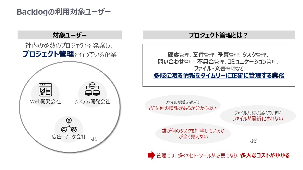 このような課題の発生により、プロジェクト管理には多くの人員やツールが必要となり、多大なコストがかかることがあります。これらの課題を解決するためのツールが「Backlog」です。