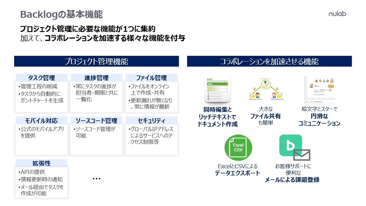 現在は、プロジェクトタスク管理ツール「Backlog(バックログ)」、ビジュアルコラボレーションツール「Cacoo(カクー)」、およびセキュリティとアカウント管理サービス「Nulab Pass(ヌーラボパス)」の3つの製品を提供しています。その中でも主力サービスは「Backlog」で、売上の大部分を占めています。