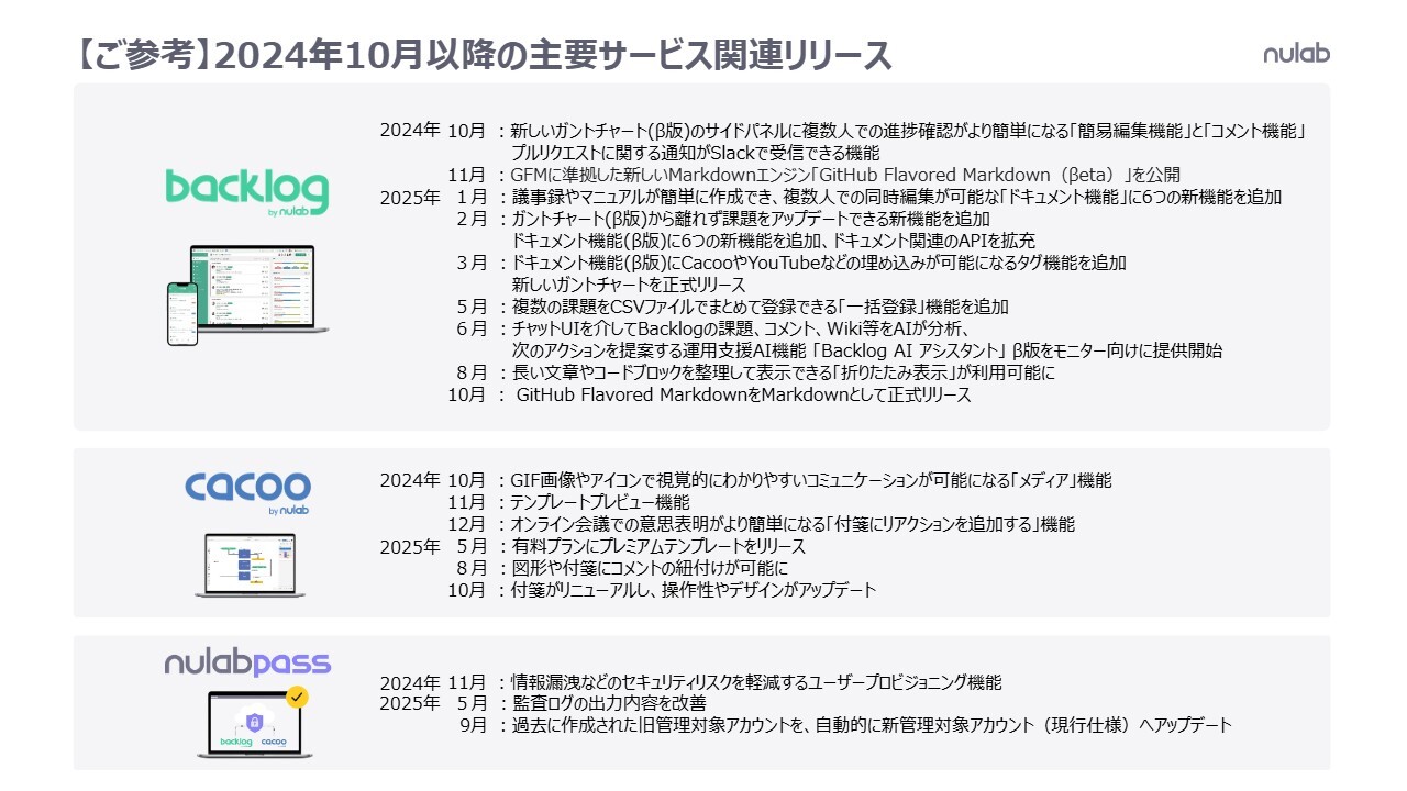 昨年10月以降にリリースした主要な新機能についてです。「Backlog」「Cacoo」「Nulab Pass」の各機能は、お客さまの声を反映し、改善に取り組んでいます。
