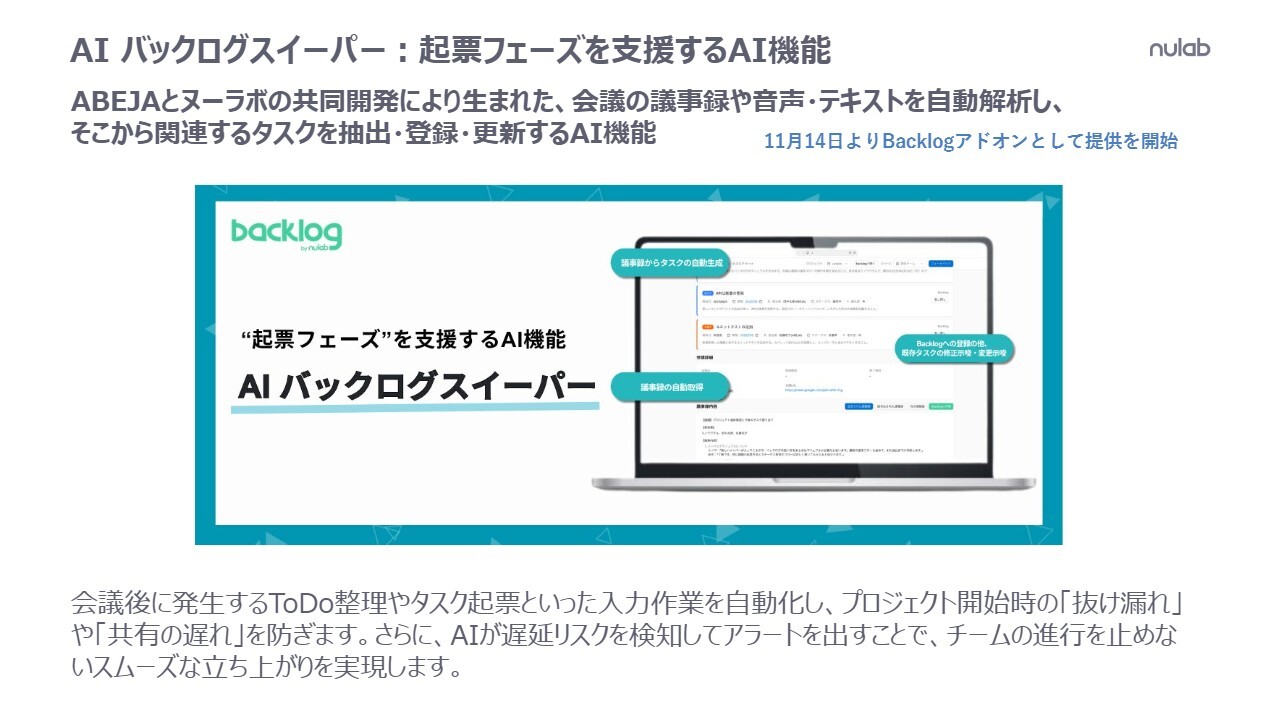 もう1つの新機能が、株式会社ABEJAと共同開発した「AI バックログスイーパー」です。「バックログスイーパー」とは、組織やチーム内で未処理の作業や停滞しているプロジェクト、抜け落ちたタスクを整理しながら、チームの仕事を前に進める役割を担う人を指します。この役割をAIで実現するのが本機能です。