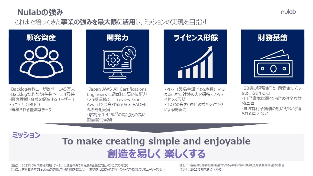 成長戦略についてです。当社は9月末時点で1万5,000件の契約件数、145万人の有料ユーザーを誇る顧客資産、解約率0.44パーセントという高い顧客満足度に裏付けられた開発力、また、製品主導の成長を支える気軽に社外の方を招待できるライセンス形態、30億円の現預金と前受金モデルによる安定した財務基盤といった強みがあります。
