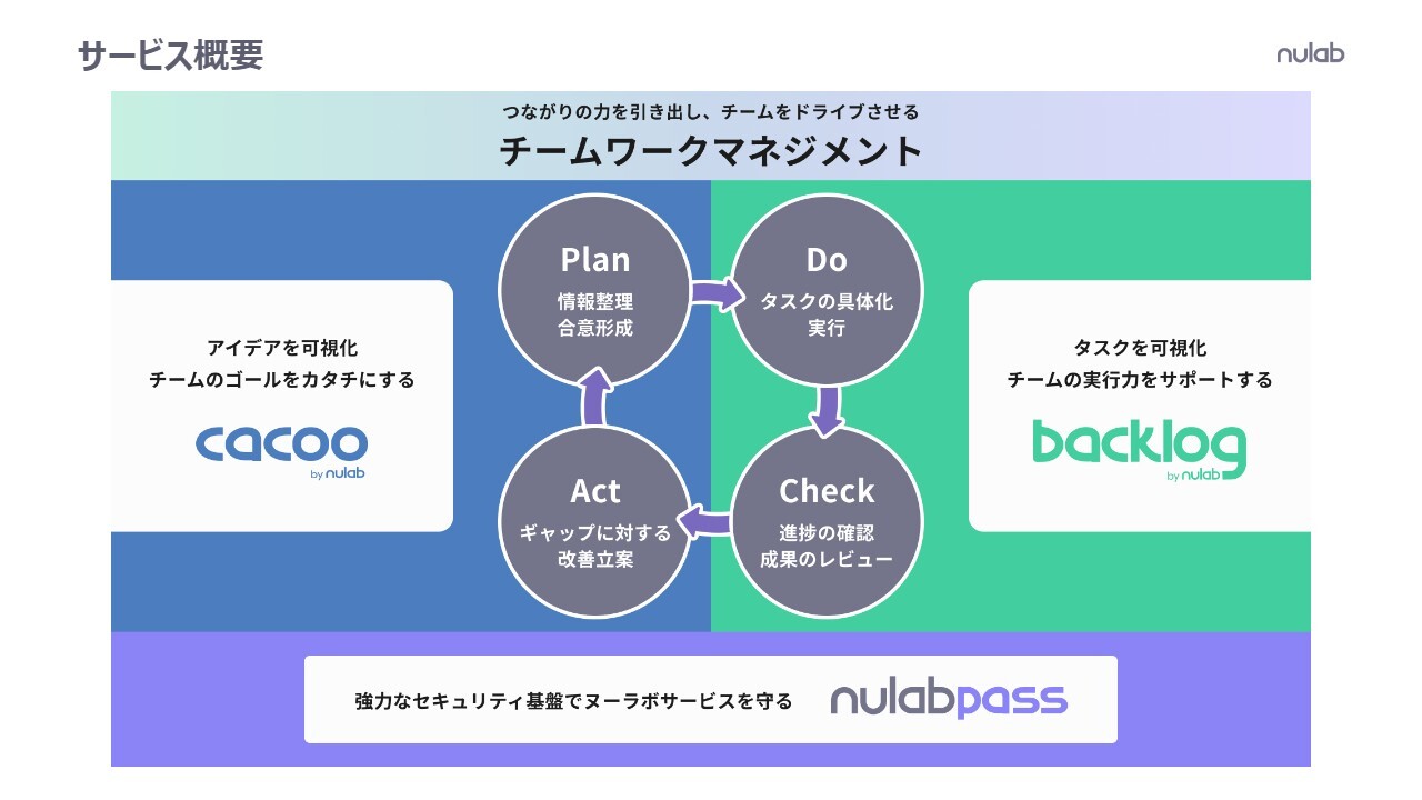 当社のサービス内容についてご説明します。主力サービスである「Backlog」、次に「Cacoo」、そして「Nulab Pass」の順にご説明します。