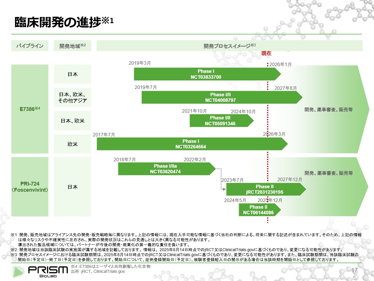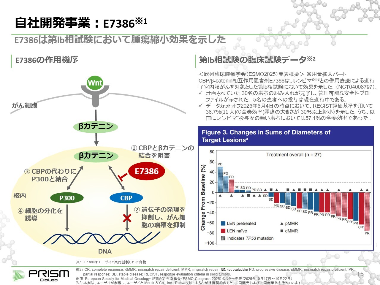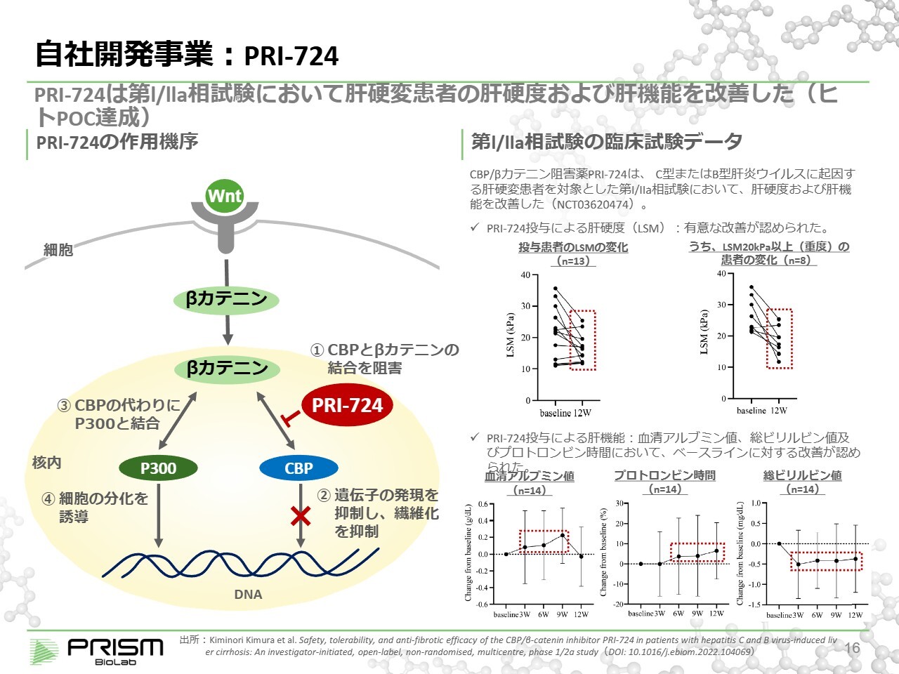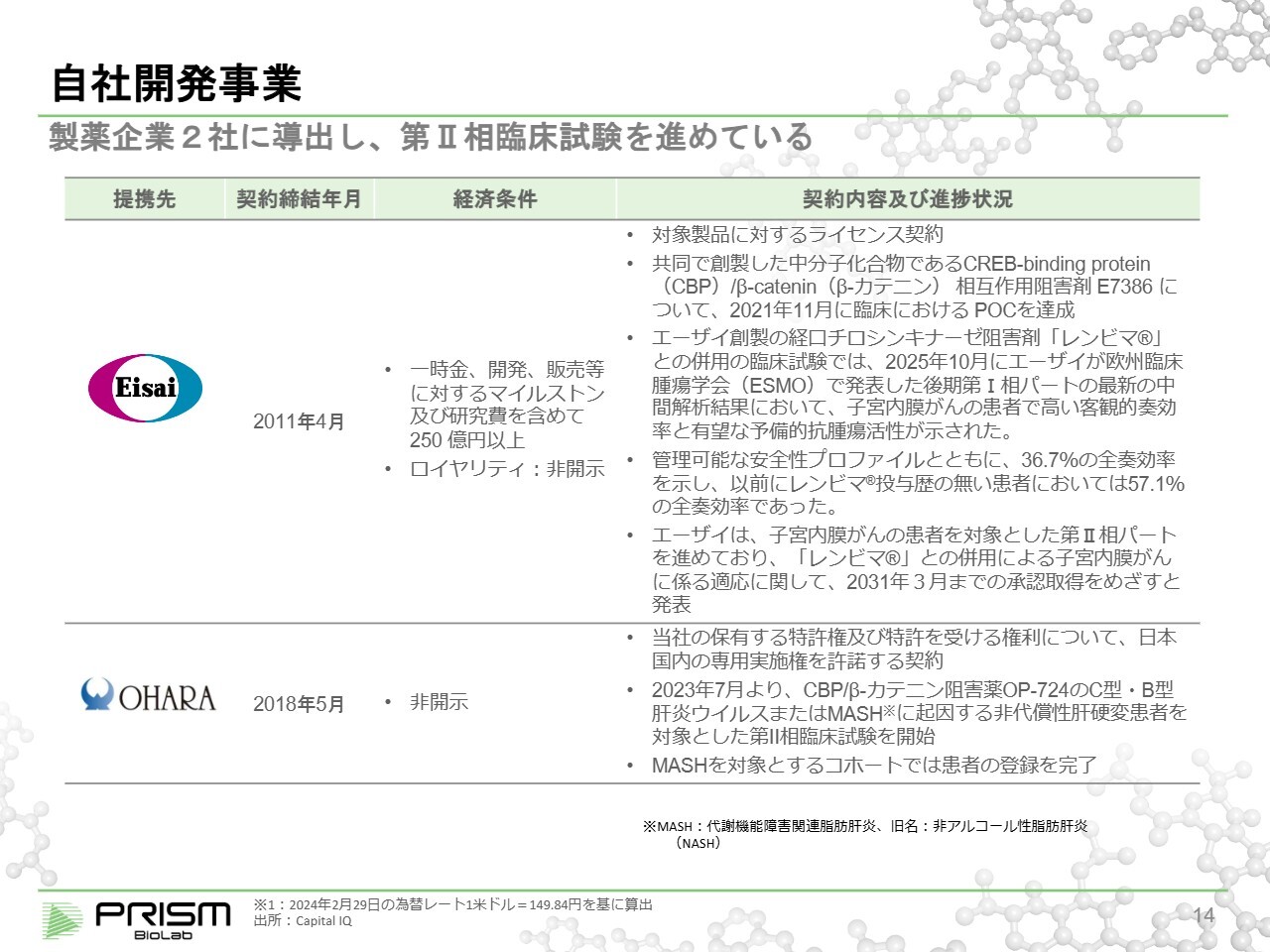 現在、2つのプログラムを製薬会社にライセンスしています。1つは「E7386」で、こちらはエーザイと共同開発した化合物ですが、当社分をエーザイにライセンスアウトしており、現在、がんの分野で開発を進めています。もう1つは「PRI-724」で、当社が創出した化合物を大原薬品工業に、肝硬変の用途でライセンスしています。