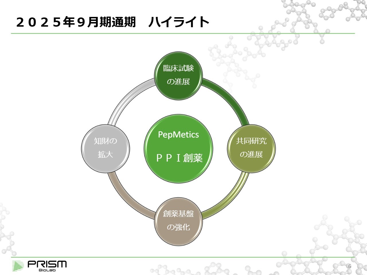 それでは通期の業績について、概要をご説明します。まず、ハイライトとして、PPI(Protein-Protein Interaction)創薬を支えるための臨床試験、共同研究、創薬基盤、知財の拡大についてお話しします。