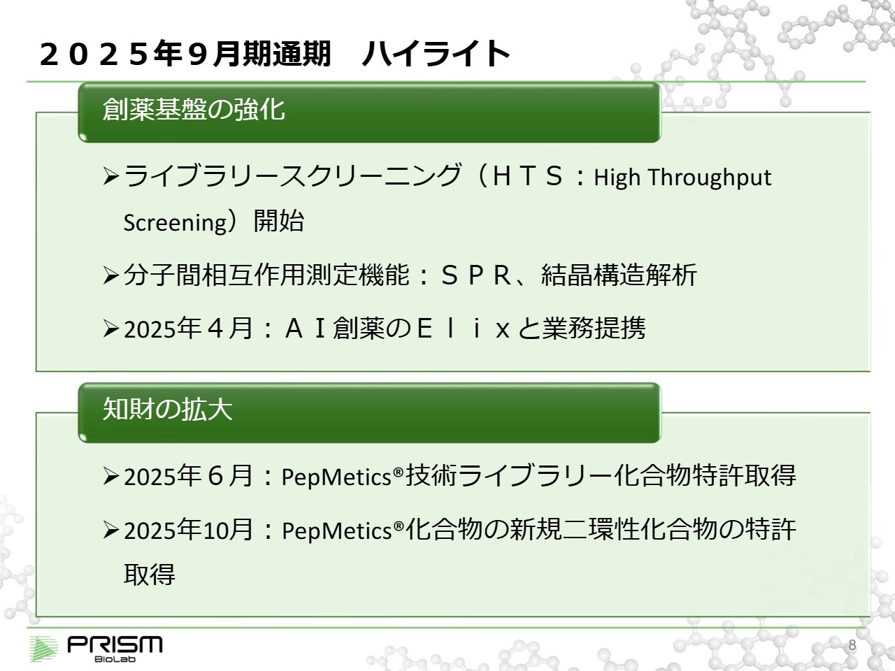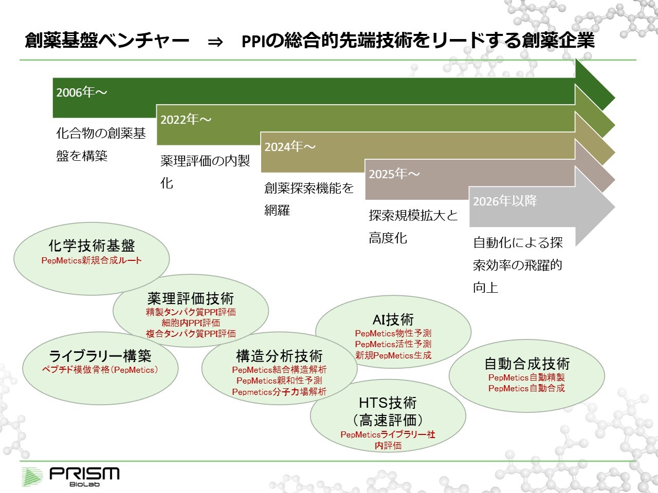 具体的には、バイオロジーや薬理評価技術、構造分析、2025年にはAI技術、さらに先ほどご説明したHTSも含め、創薬に関するプロセスを自社内で完結できる体制を構築してまいりました。