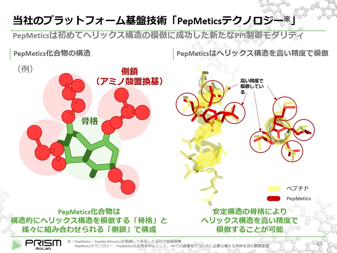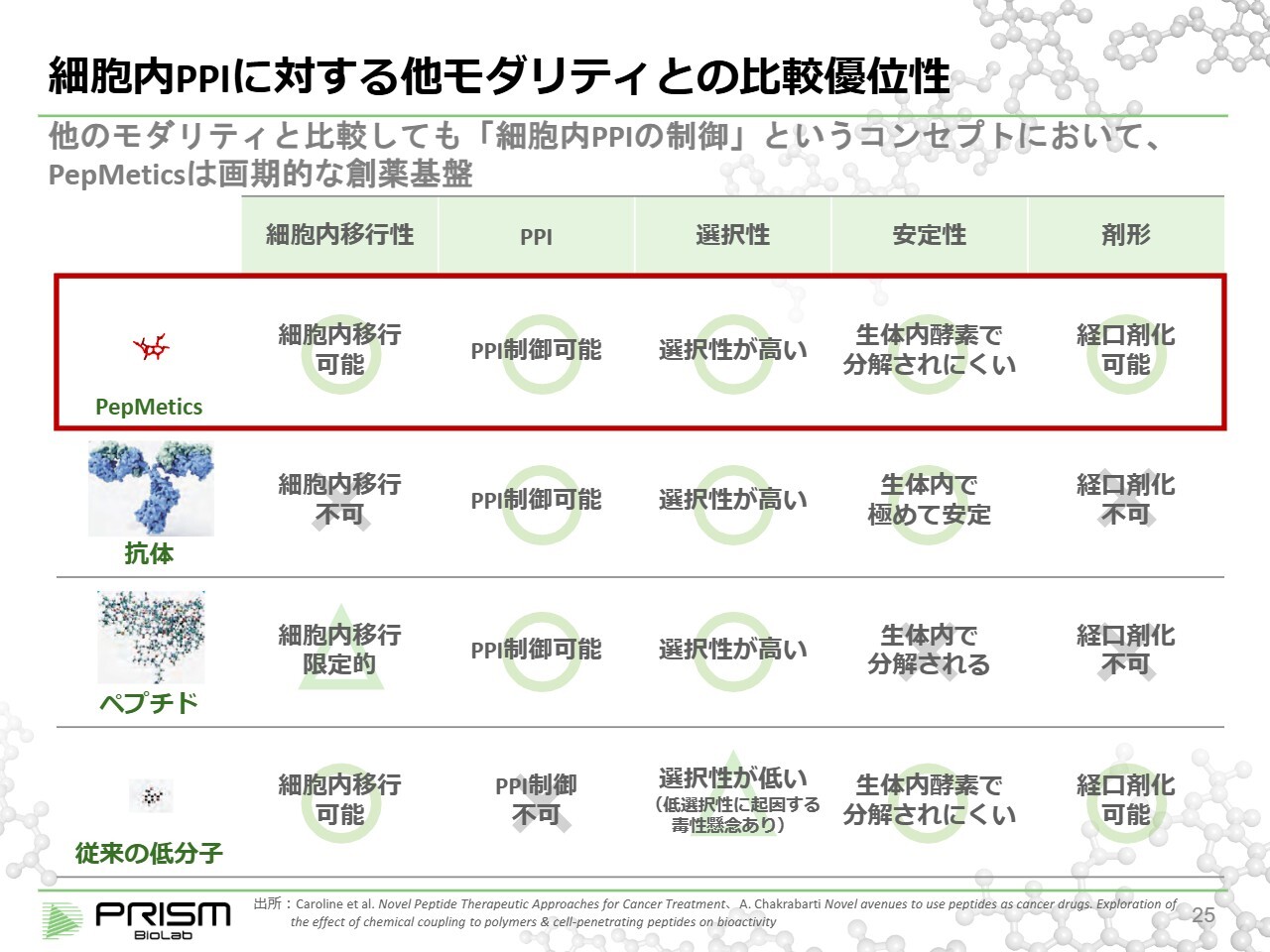 それに対して「PepMetics」は、細胞内に入ってPPIを制御するとともに、選択性が高く、経口剤としても利用可能な新しいモダリティとして可能性を秘めています。