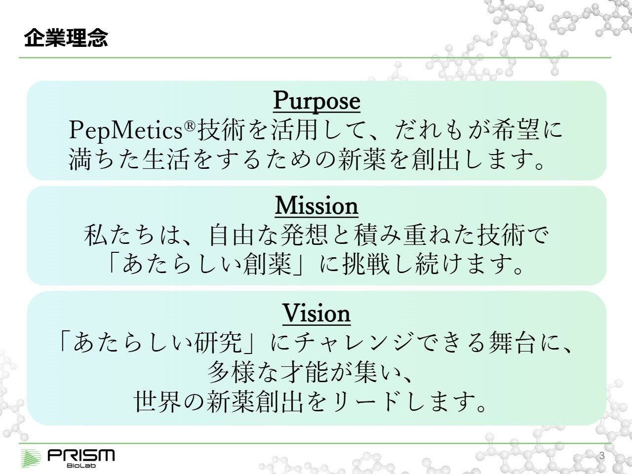 当社は、「PepMetics」技術という画期的かつ独自の創薬技術を用いて新薬を創ることで、みなさまに希望に満ちた生活を提供することを目的としています。新薬の創出は極めて困難です。特に当社の技術は、これまで創薬が難しいと言われてきた新しい標的を目指すものであり、そのためには自由な発想と優れた技術を活用して新しい創薬を創り出すことが求められます。