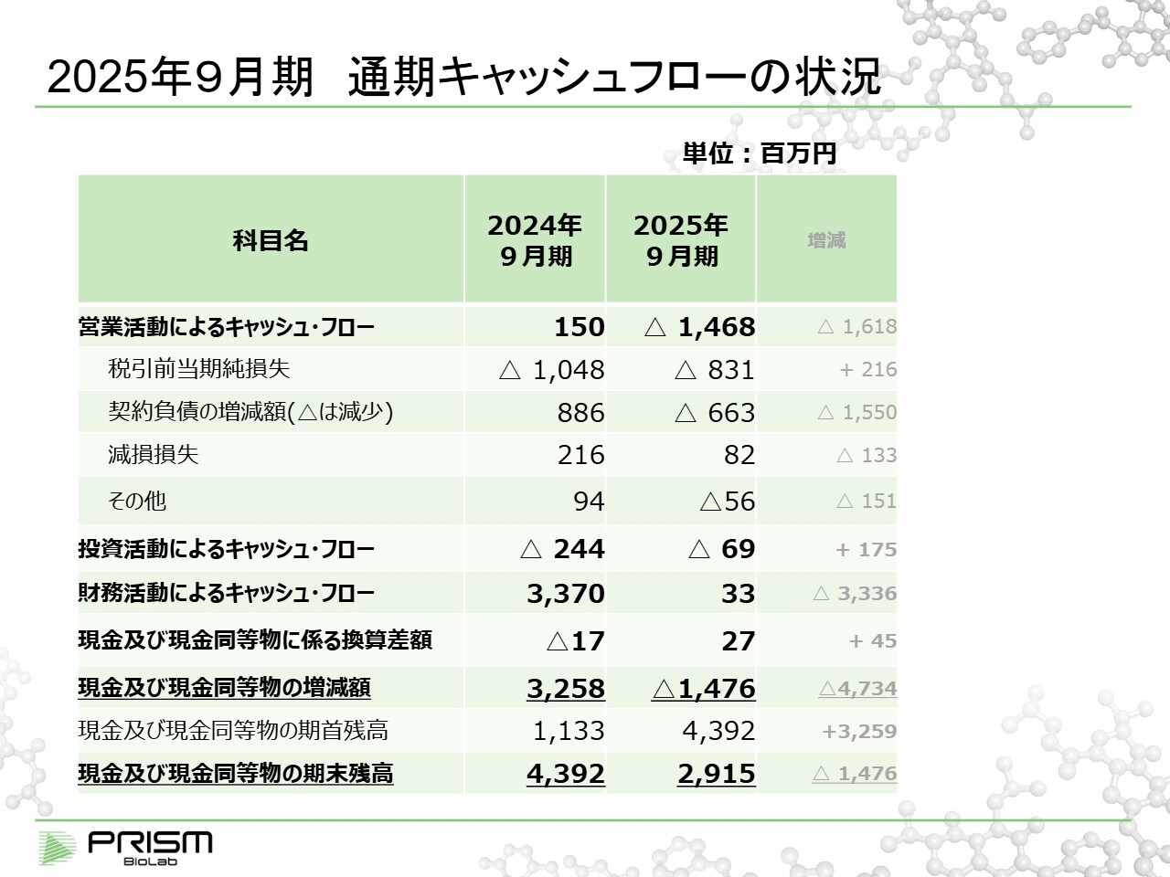 キャッシュフローについては、先ほどお話しした約14億7,000万円が営業キャッシュフローとしてマイナスとなっており、ほぼ同額が全体のキャッシュフローのマイナスとなっています。以上が財務状況です。