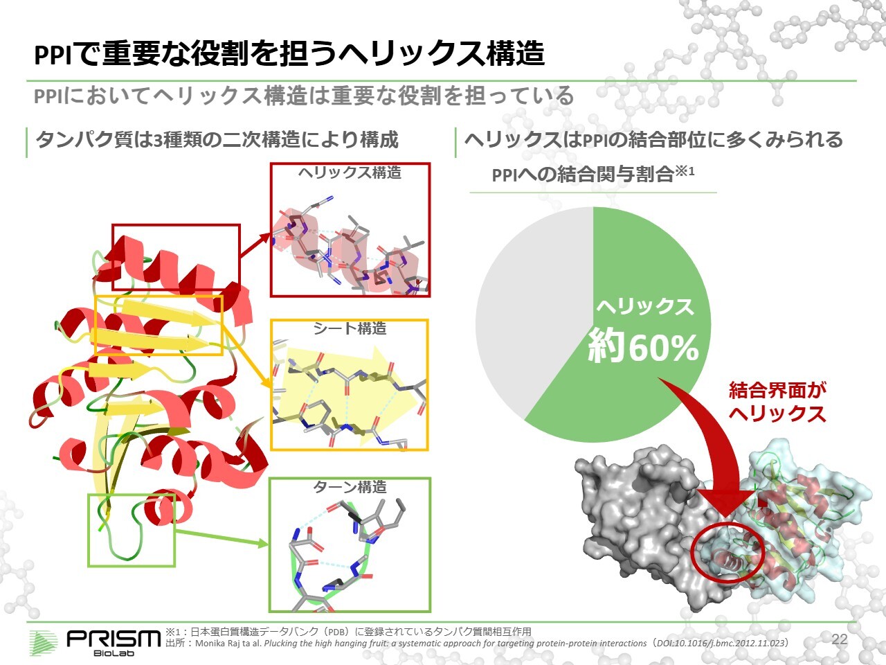 まず、タンパク質間相互作用(PPI)は非常に有望な創薬標的とされています。しかし、これは難しいと言われ、これまで薬として実用化されるケースが少ないのが現状です。もしこれを薬にすることができれば、さまざまな治療に結び付くと考えられています。このPPIにおいて重要な役割を果たしているのがヘリックス構造です。これは、タンパク質の一定の構造を示すもので、後ほど詳しくご説明します。
