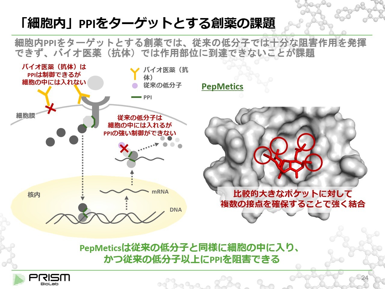 まとめますと、従来の低分子は細胞内には入るものの、PPIを制御することができません。一方で、PPIを制御できるような大きな化合物、抗体やペプチドはなかなか細胞内に入っていきません。またそれらは安定性の問題もあり、経口剤として利用するまでに多くの課題があるのが実情です。