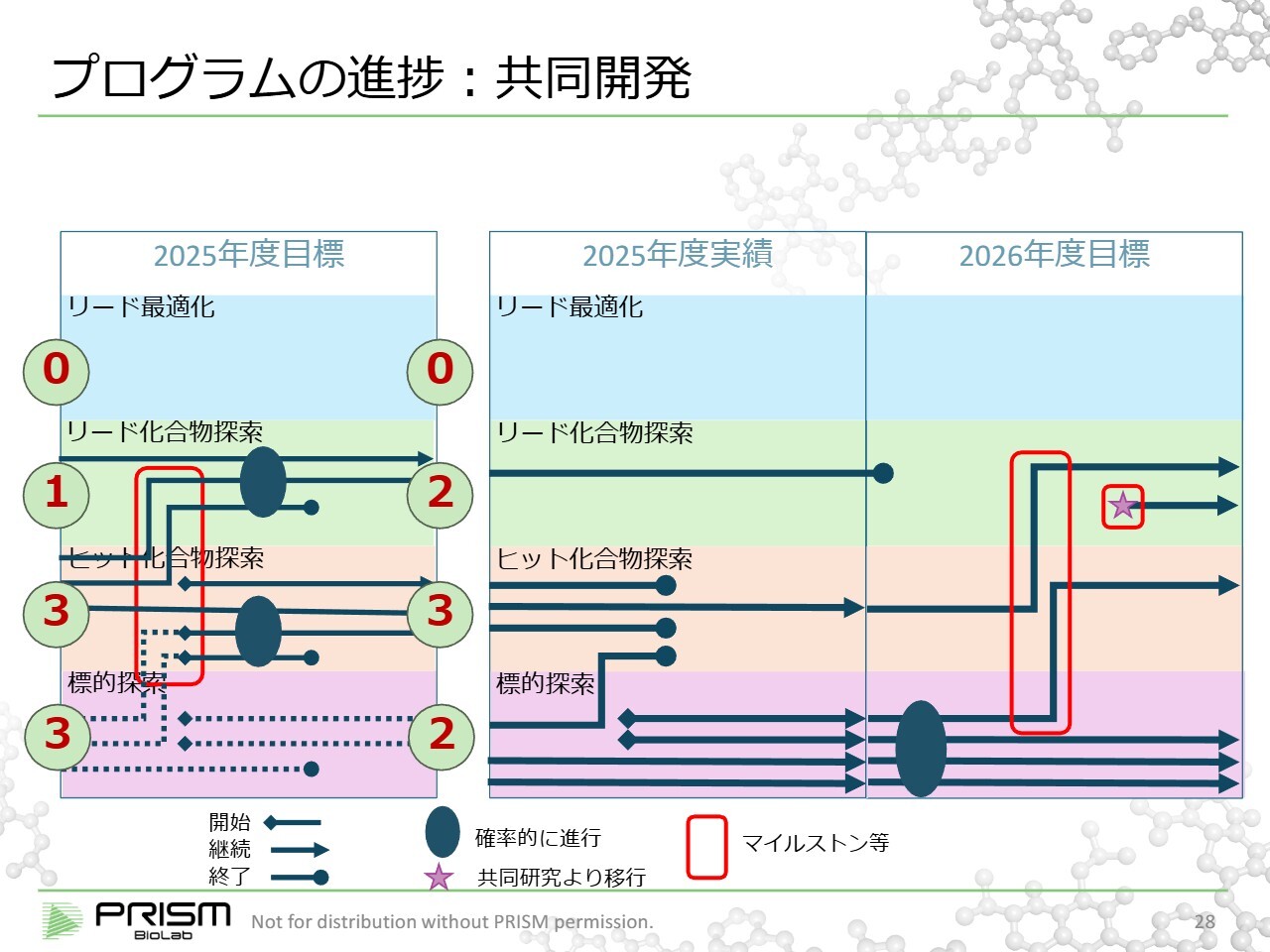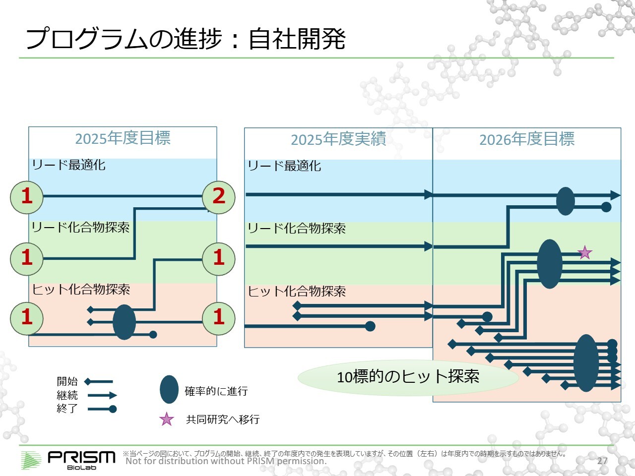 「ヒット化合物探索」の中で、およそ半分の確率で次のステージに進む状況ですので、10標的中4つは期中では結果が出ないとしても、その他の6つのうち3つが「リード化合物探索」のステージへ進むと見込まれます。加えて2025年度に開始している2つのうち1つが進むとすれば、2026年度の「リード化合物探索」のステージには合計で4つほどのプログラムが進行中となると見ています。