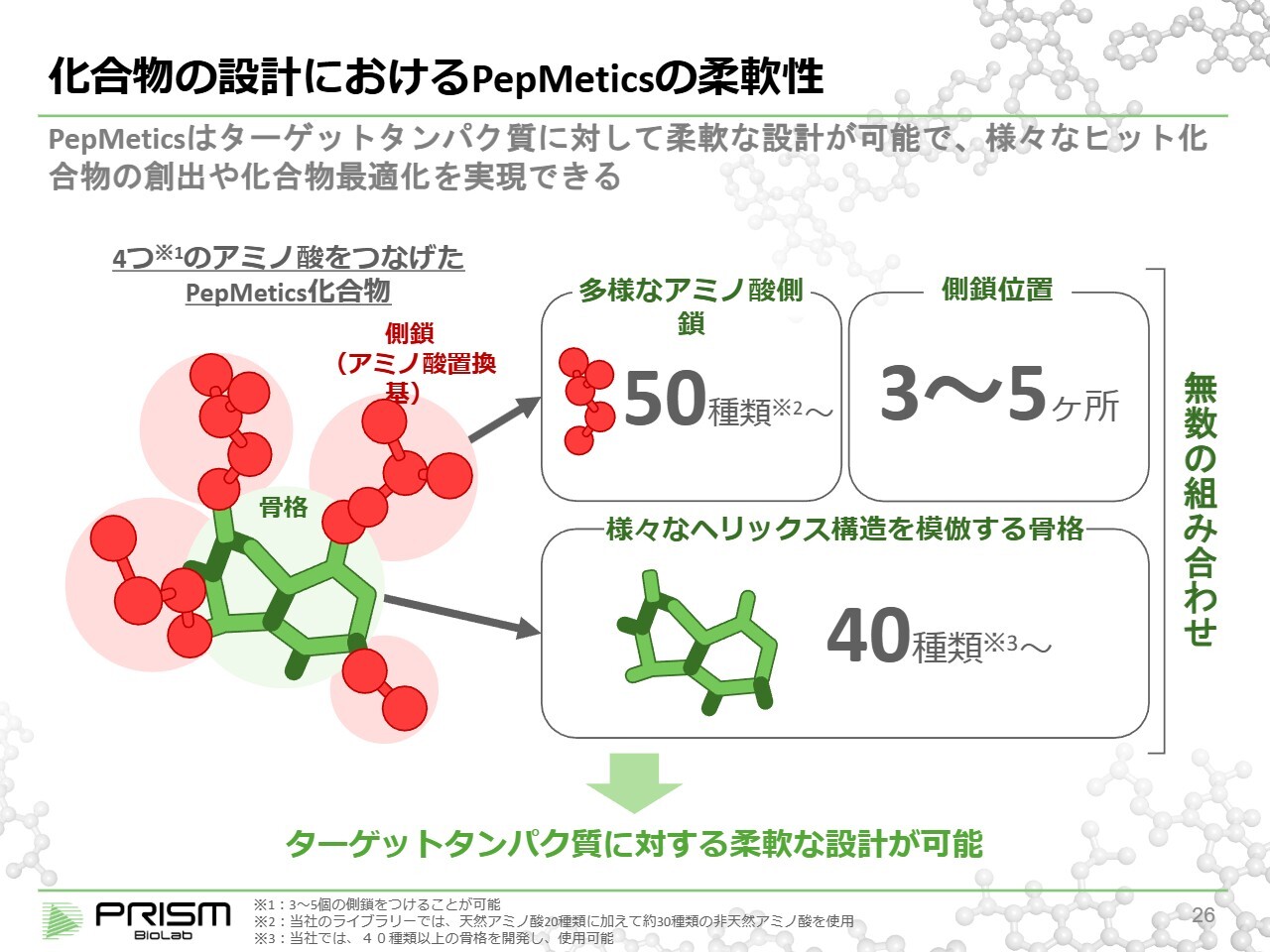 当社は「PepMetics」を40以上の骨格で構成しております。この数は今後も増加しています。また、20種類の天然アミノ酸を含む50種類以上のアミノ酸を標準的に用意しており、例えば、4つの側鎖を合成すると、40掛ける50の4乗で、約2億5,000万通りの設計が可能です。その中で約3万の化合物をライブラリとして確保し、それを基に創薬を進めています。