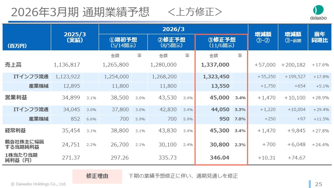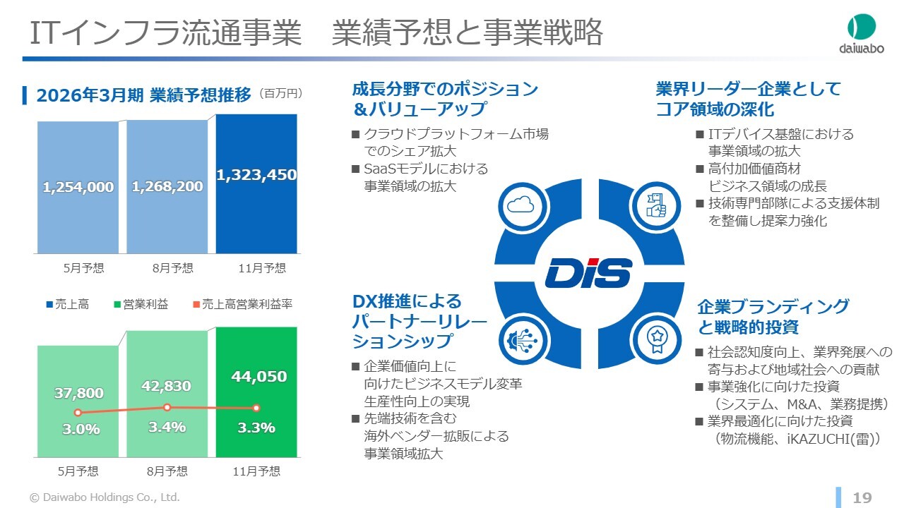 ITインフラ流通事業の今期業績予想については、これまで5月、8月と上方修正を行ってきましたが、実績と傾向分析に基づき、現時点では売上高を1兆3,234億円、営業利益を440億円とさらに上方修正しました。