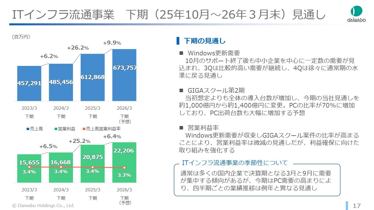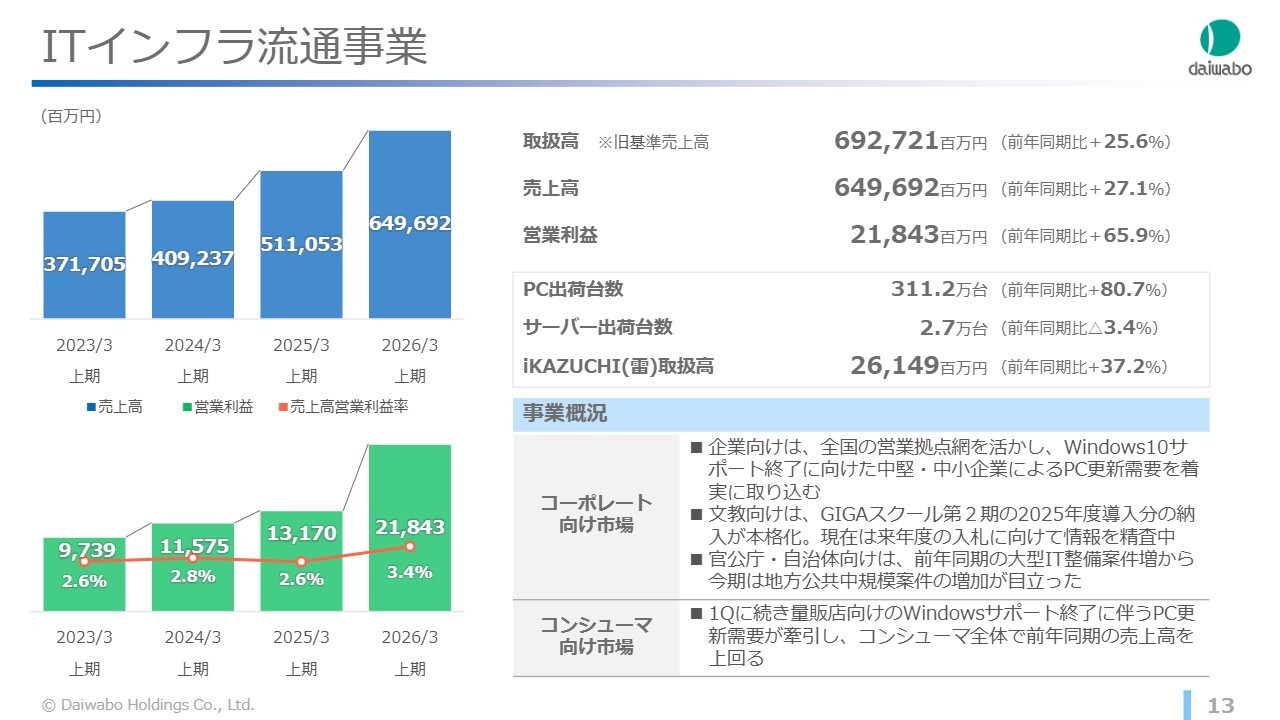 まずはITインフラ流通事業です。この上期は、企業向けで10月にサポートが終了したWindows10の中堅・中小企業によるPC更新需要が加速し、売上高と利益を大きく牽引しました。