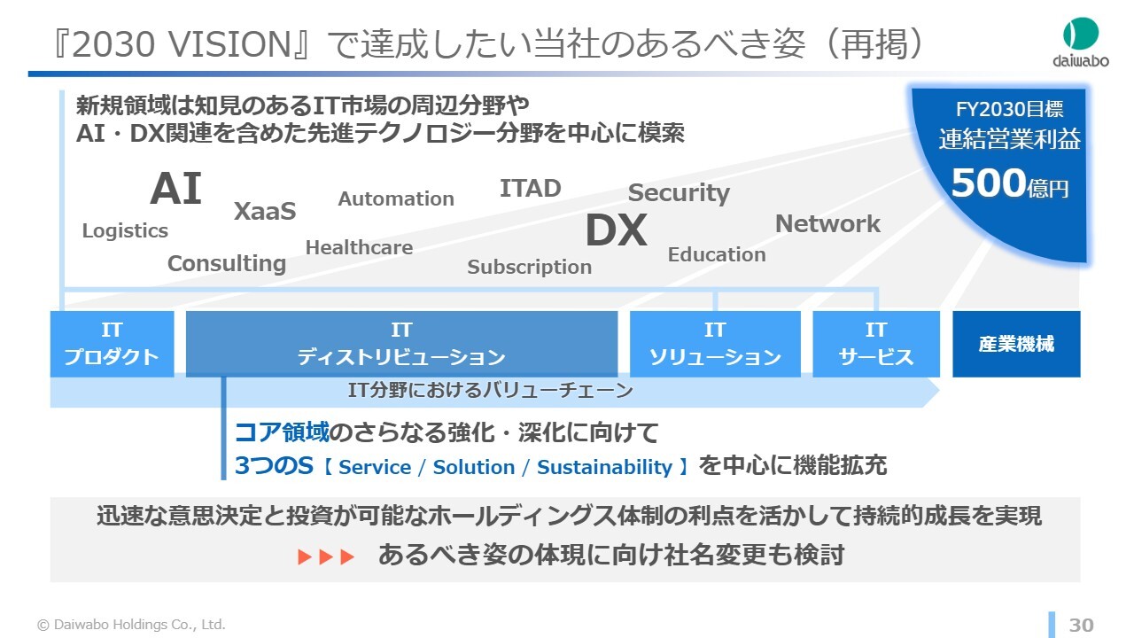 2030年度の連結営業利益500億円の達成に向けて、既存のITインフラ流通事業はITディストリビューション分野として絶対的なコアとしつつ、新たな事業領域を模索し、最適な事業ポートフォリオの検討を進めています。現時点で詳細はお伝えできませんが、持続的成長に向けてさまざまな検討を進めています。