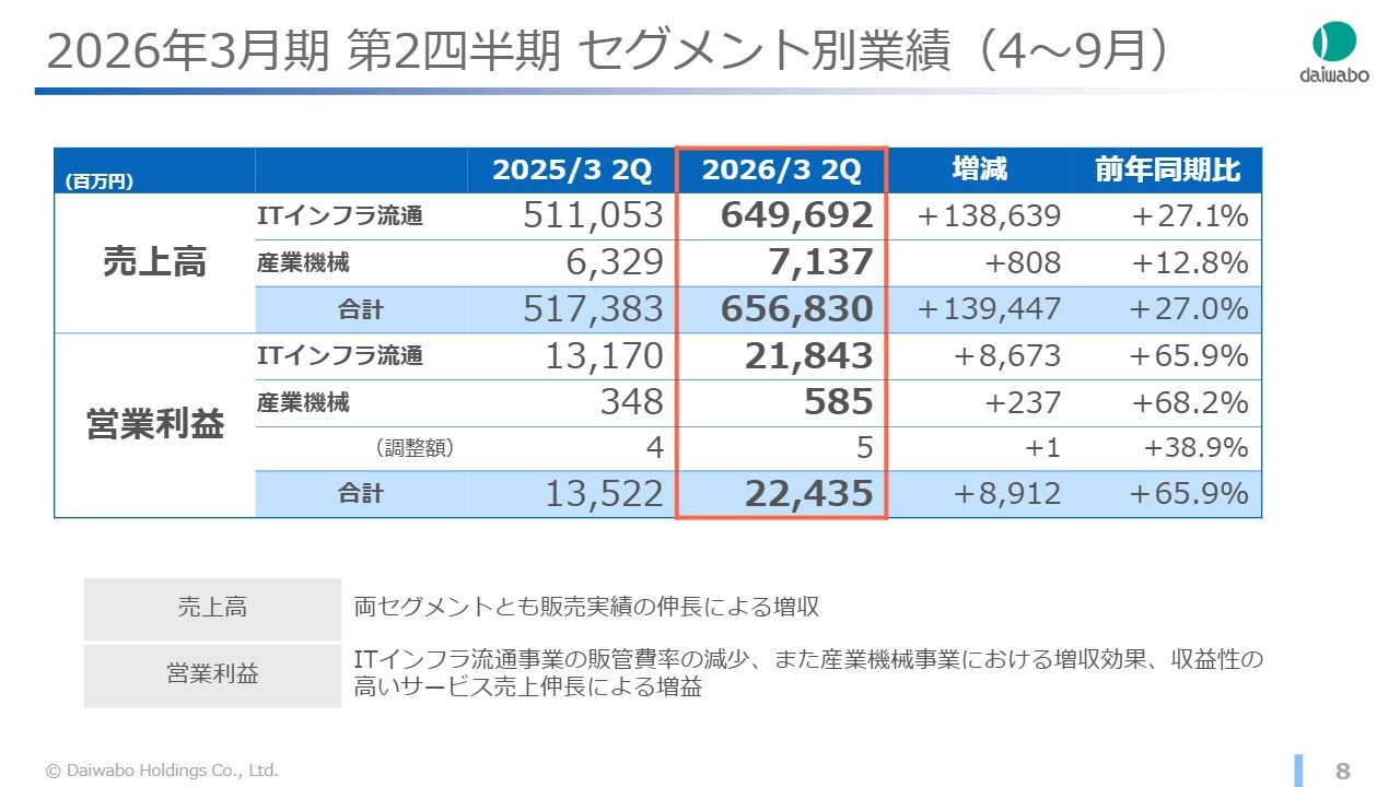 セグメント別に見た第2四半期累計の業績です。スライドに記載のとおり、売上高・利益ともに好調なITインフラ流通事業が大きく牽引し、産業機械事業も前年同期を大きく上回り、増収増益となっています。いずれも営業利益における貢献が見て取れます。