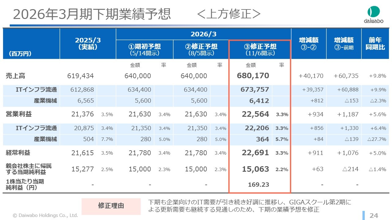 まず、下期の業績予想です。売上高は、企業向けのIT需要が引き続き好調に推移し、GIGAスクールの今期導入も増加する見通しから、期初予想より401億円増加の6,801億円となります。