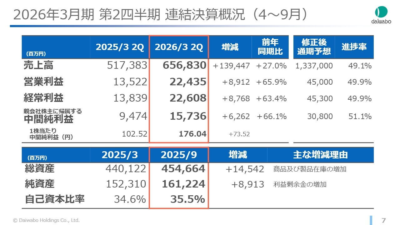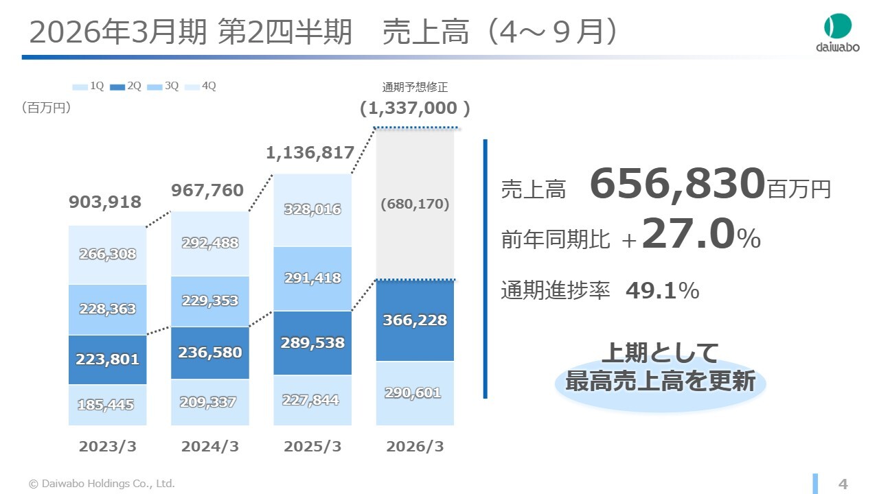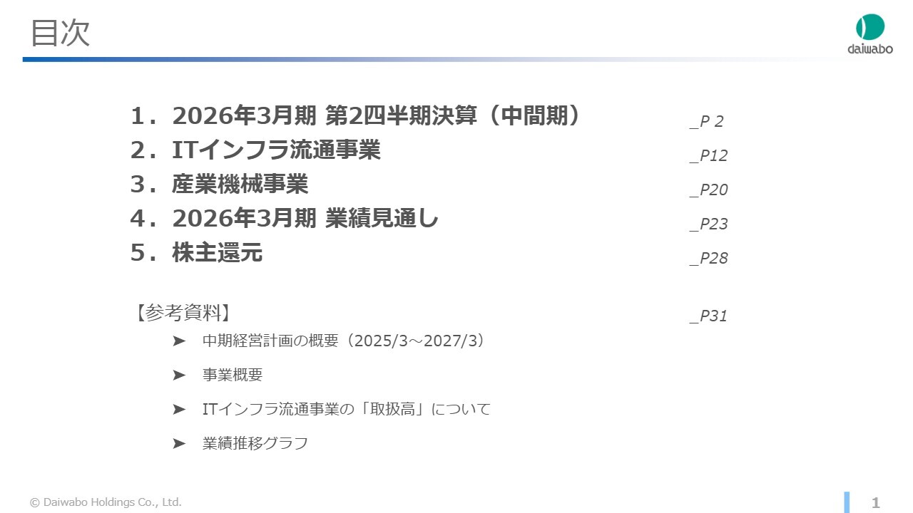 西村幸浩氏:ダイワボウホールディングス代表取締役社長の西村です。本日はご参加いただきありがとうございます。それでは、2026年3月期中間決算についてご説明します。
