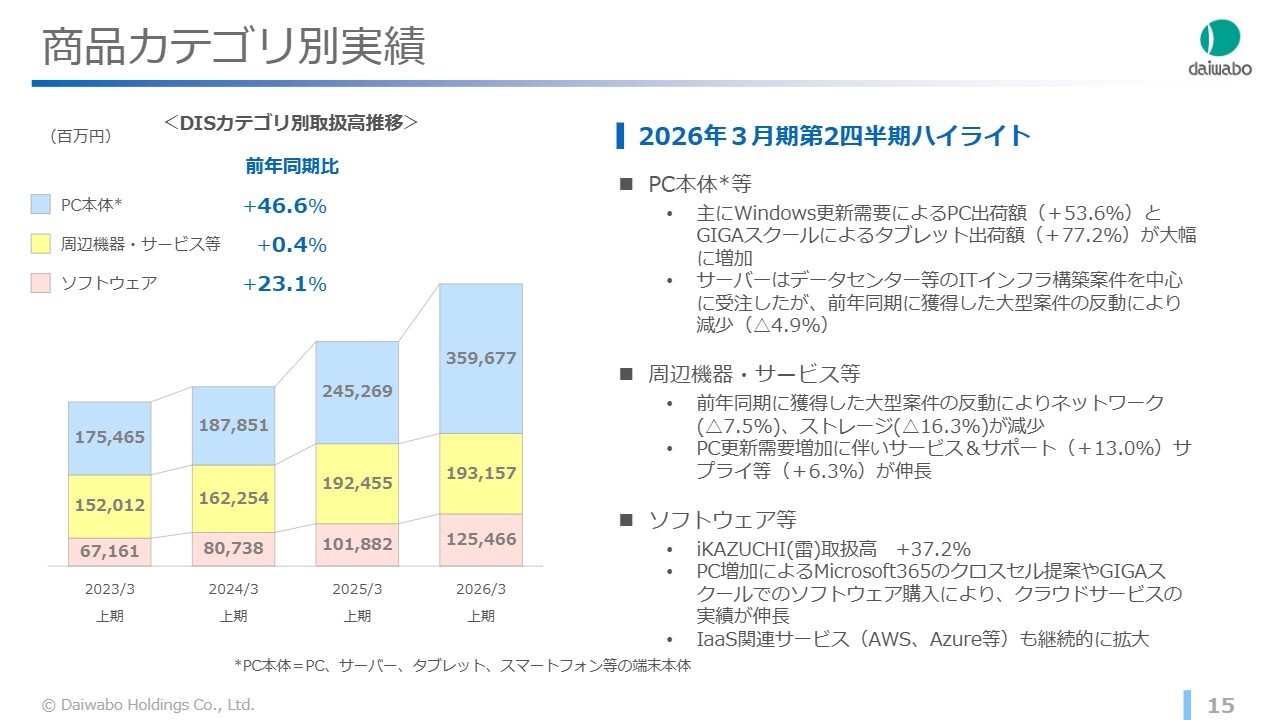 主要カテゴリの金額ベースで見た実績です。PCやサーバーなどデバイス販売金額は前期比46.6パーセント増となりました。周辺機器・サービスカテゴリはほぼ横ばいでしたが、ソフトウェアの取扱高が前期比23.1パーセント増と、大きく成長しました。