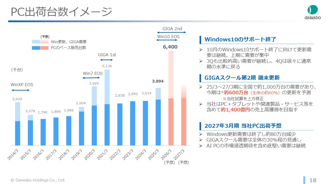 なお、今期については、特需分を考慮した上で、PC出荷台数予測を520万台から640万台に変更しました。来年度については、Windows更新需要やGIGAスクールのピークが終わり、全体台数は減少するものの、ベースとなる販売台数はしっかりと伸ばしていきます。