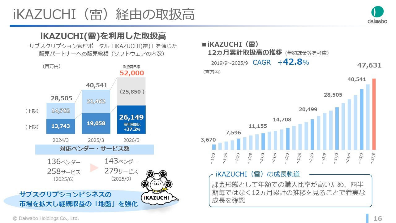 その好調な「iKAZUCHI(雷)」経由のサブスビジネスについてご報告します。DISのオリジナル管理ポータルである「iKAZUCHI(雷)」経由の取扱高は、上期実績で261億円でした。