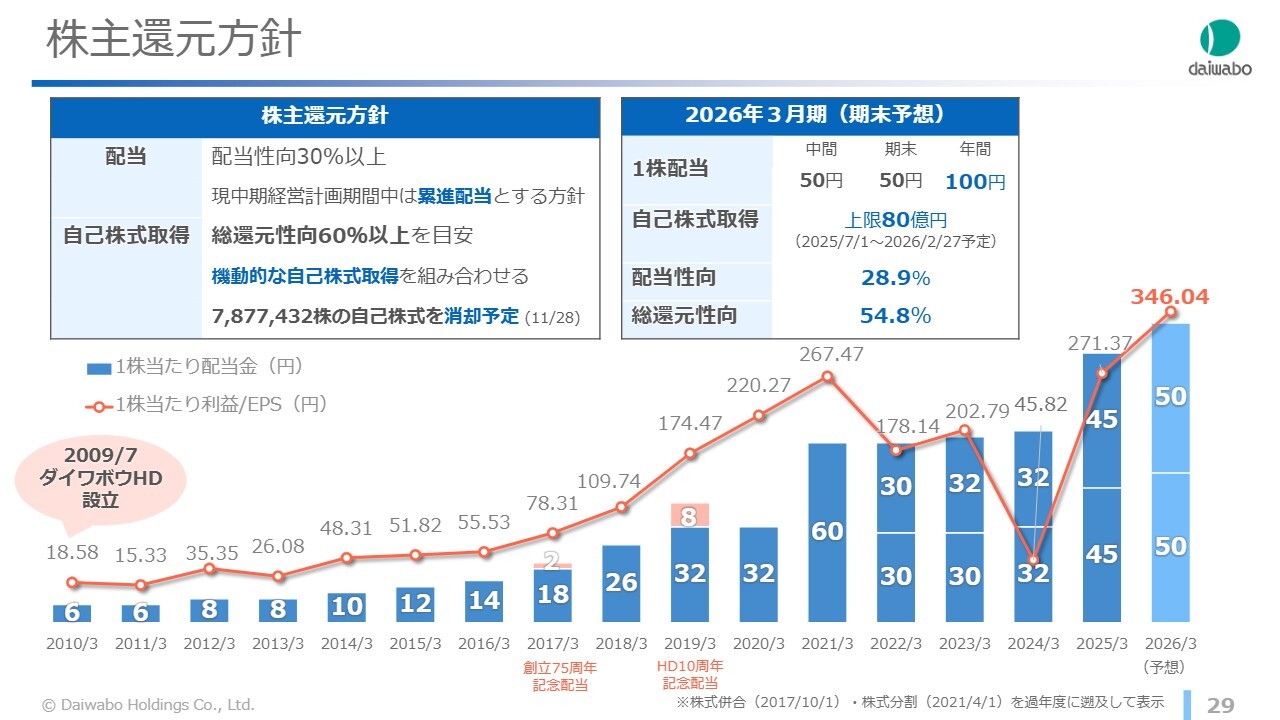 自己株式取得は、上限を80億円として7月から開始し、現在取得中です。また、自己株式の消却は11月28日に実施します。約787万株を消却予定です。