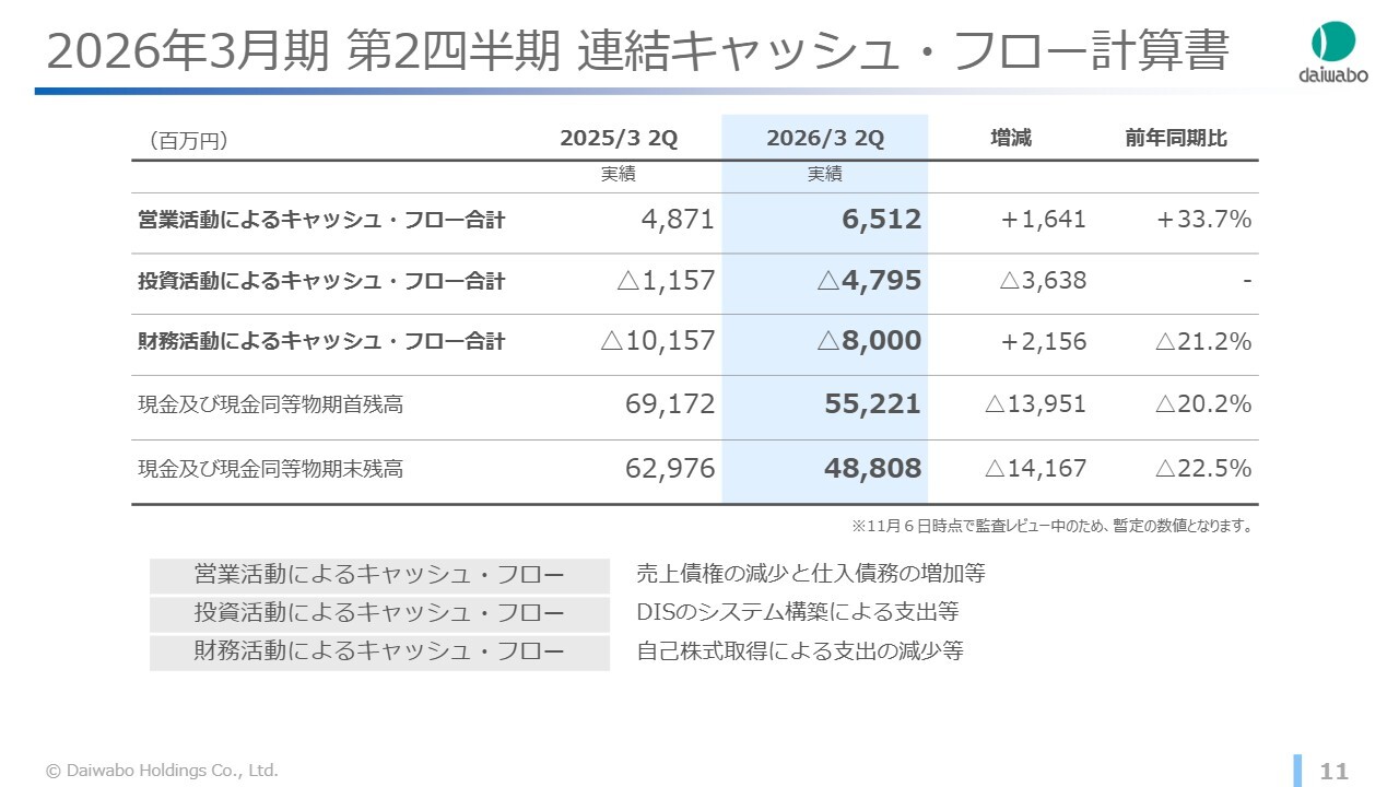 財務活動によるキャッシュ・フローは、自己株式取得による支出が前年同期より減少しました。