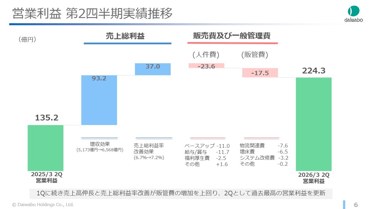 第2四半期の営業利益実績です。営業利益は224億円で、前期比65.9パーセントの増益となりました。売上高の伸び以上に、営業利益を大幅に伸ばすことができました。こちらも上期として過去最高の実績となります。
