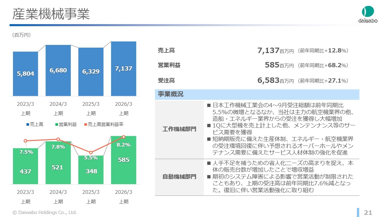 以上の結果、産業機械事業の上期売上高は前期比12.8パーセント増の71億円、営業利益は前期比68.2パーセント増の5億円となりました。