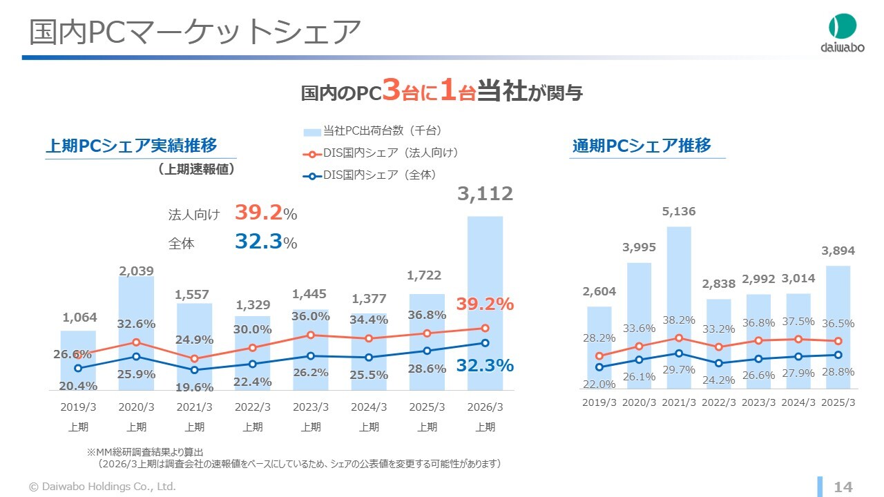 国内PC出荷台数における当社のマーケットシェアの推移です。スライド左側のグラフが上期の実績を示しています。2020年3月期の上期に初めて200万台を突破しましたが、今上期は一気に300万台を超え、311万2,000台を出荷しました。