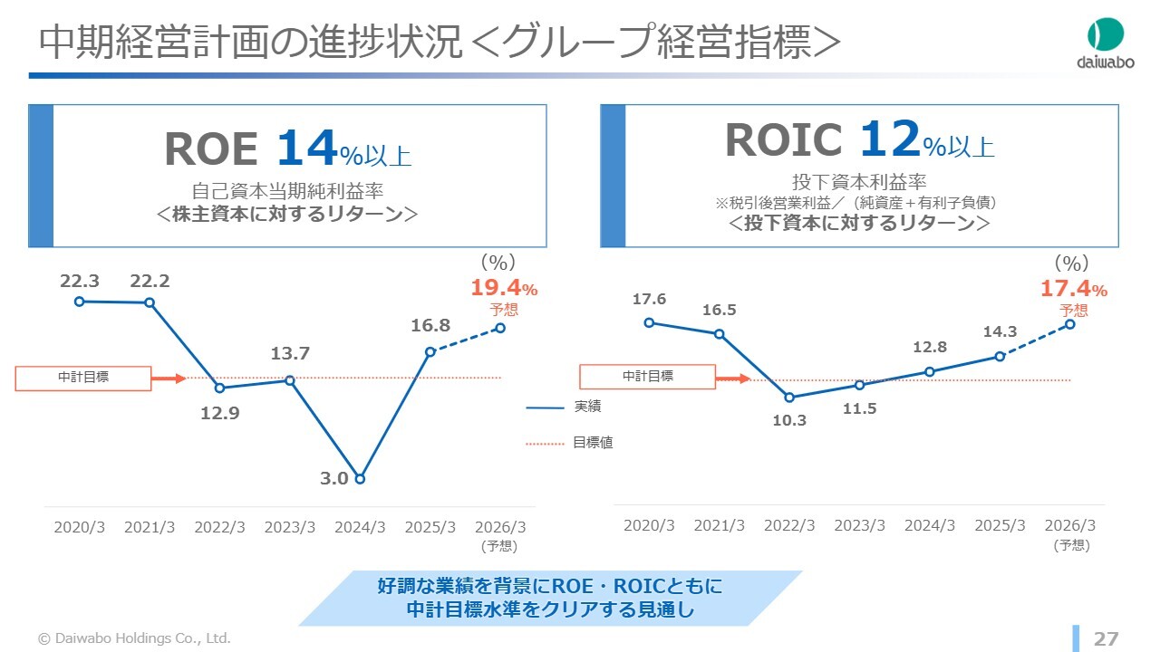 2026年3月期のROEは19.4パーセントの予想です。ROICについても、目標を大きく上回り、17.4パーセントと予想しています。
