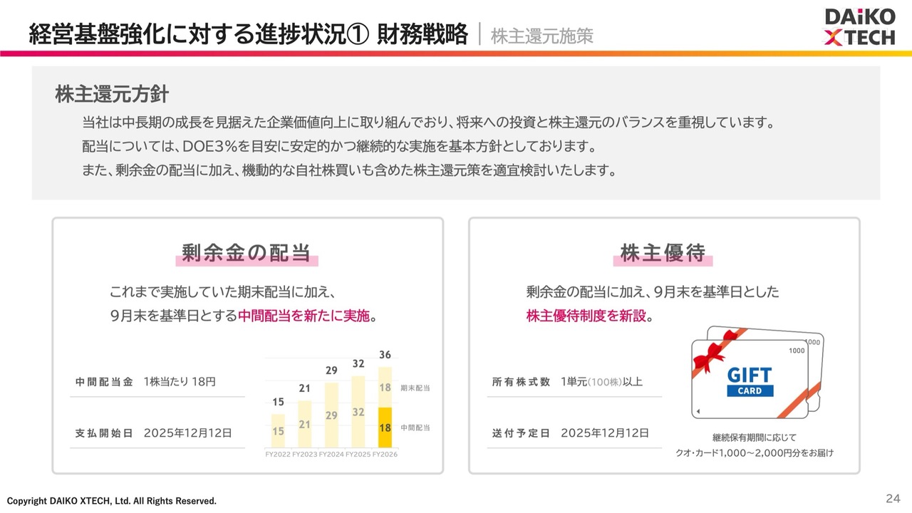 株主還元方針です。当社は、中長期の成長を見据えた企業価値向上に取り組んでおり、将来への投資と株主還元のバランスを重視する方針を掲げています。配当については、先ほどお話ししたとおり、予定どおり中間期において1株当たり18円の配当を実施し、株主優待についても推進していきます。
