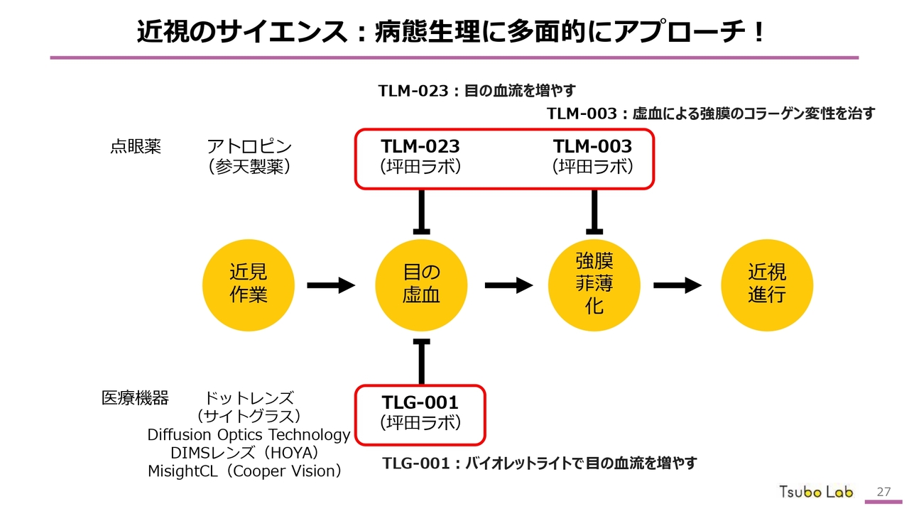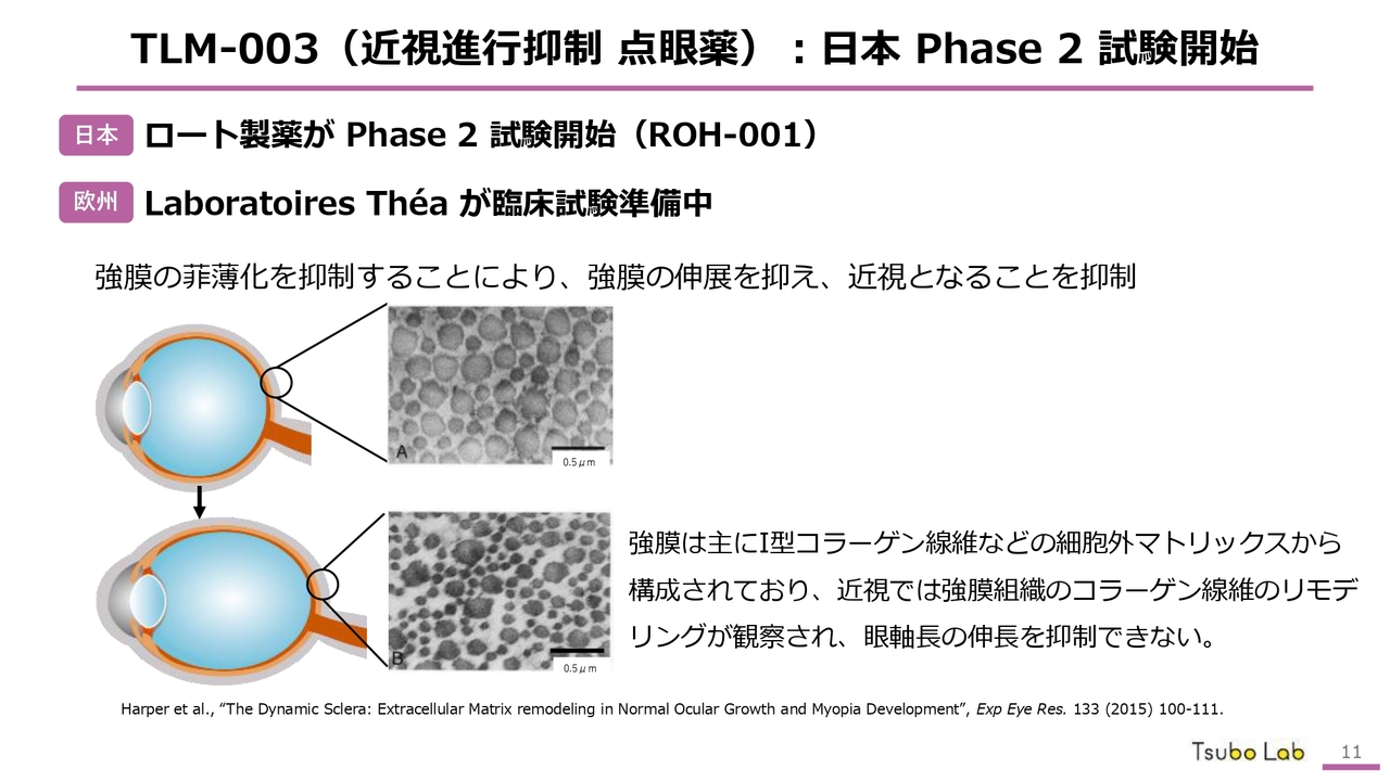 もう1つは「TLM-023」です。これは近視進行を抑制するための新たな点眼薬で、現在は特定臨床研究または治験に向けて、前臨床データを整えている段階です。