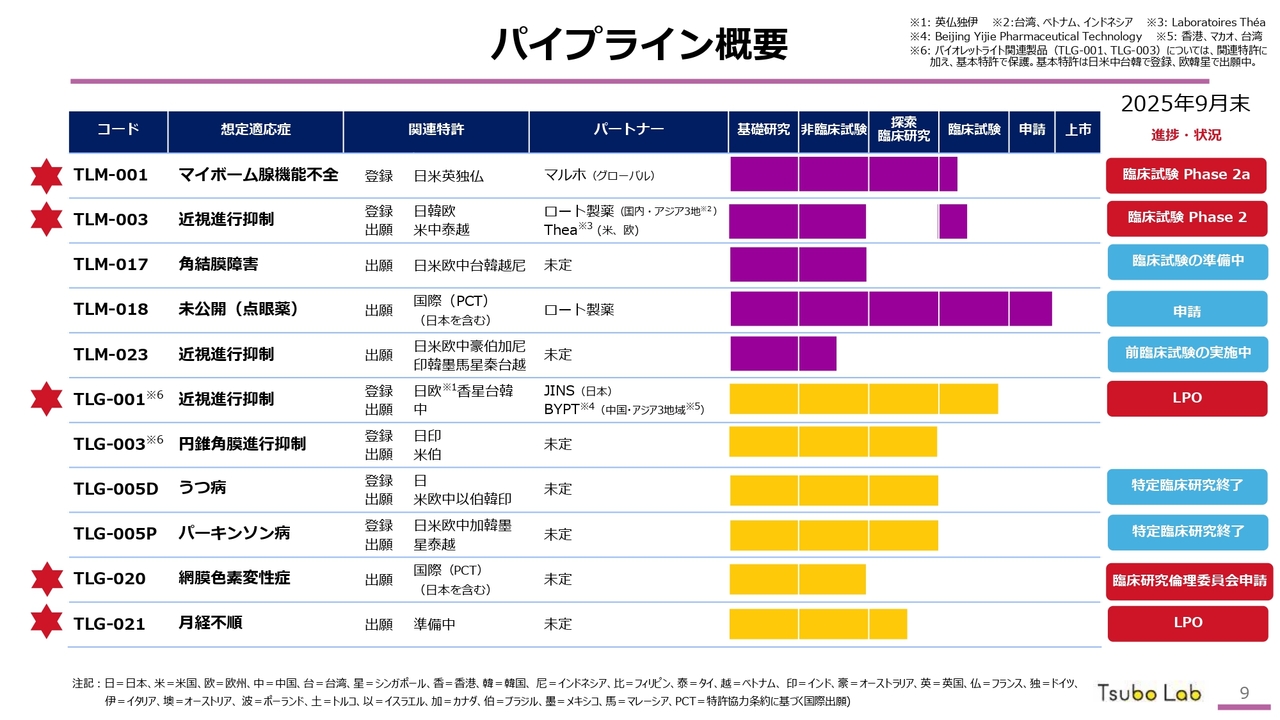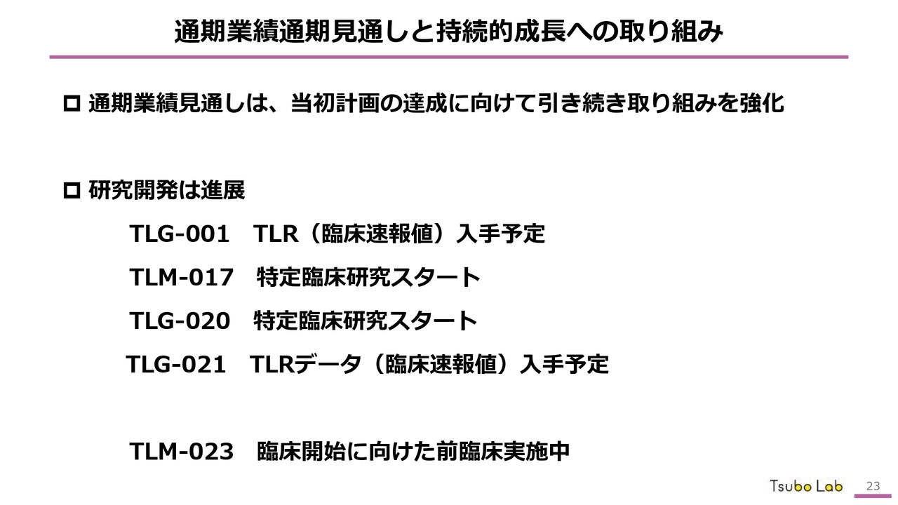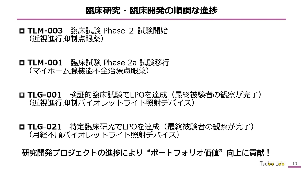 研究開発は非常に順調に推移しており、後ほど詳しくご説明しますが、「TLM-003」という近視進行抑制点眼薬のPhase2試験が開始されました。また、マイボーム腺機能不全治療点眼薬はPhase 2a試験に移行しました。
