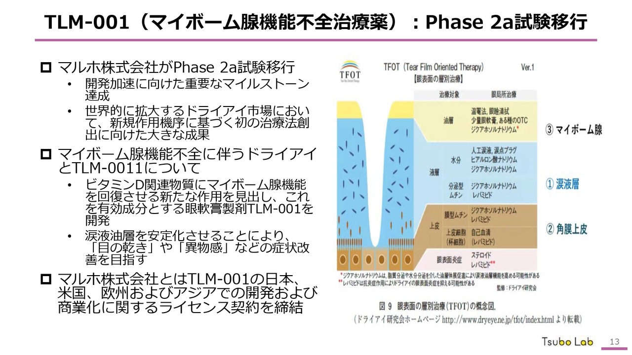 「TLM-003」についてご説明します。日本国内では、ロート製薬とともに開発を進めています。欧米では、フランスの目薬メーカーであるLaboratoires Théaと大型契約を結び、研究を進めています。