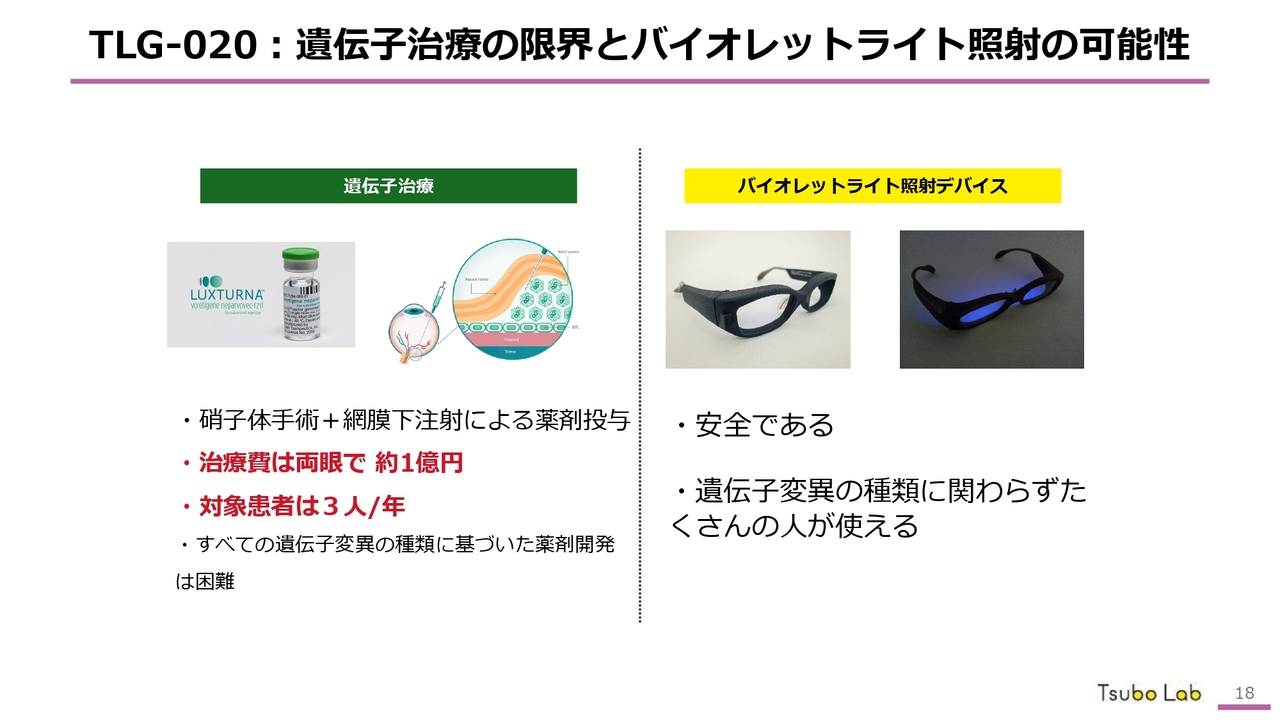 このような概念に基づき、当社では眼鏡および点眼薬を開発しています。「TLG-001」は、先ほどもお話ししましたバイオレットライト照射デバイスです。「TLM-023」は、新しく臨床研究のために準備している点眼薬です。