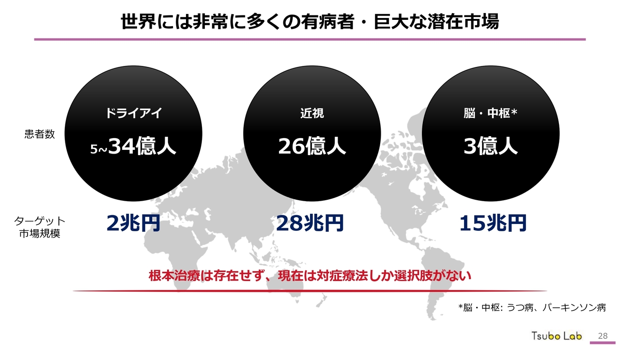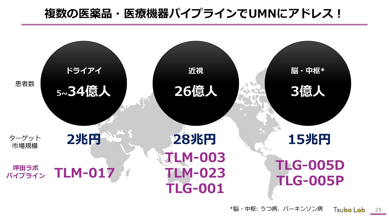 スライドの下に記載されているのは、現在坪田ラボが開発を進めている各市場向けパイプラインです。パイプラインを少しずつ増やしつつ、すでにスタートしているものについては、その進捗を着実に進め、なるべく早く社会に届けられるよう鋭意努力しています。