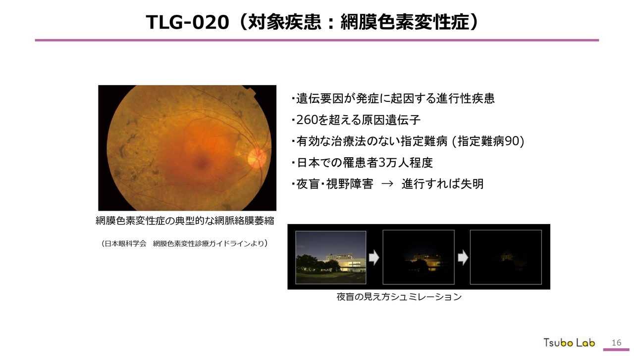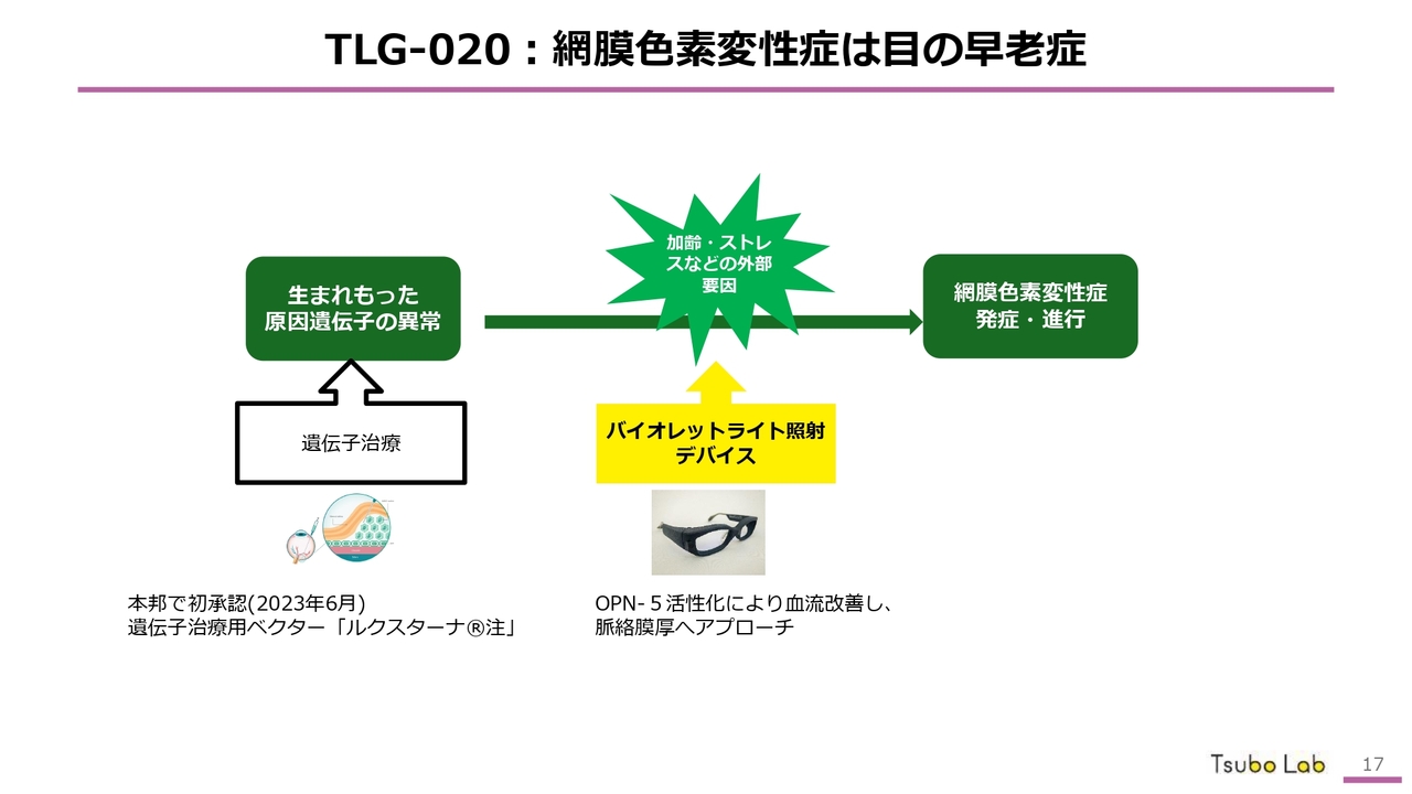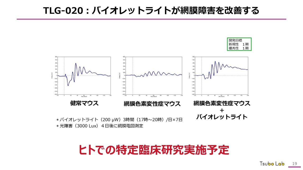 3つ目の「TLG-020」は、先ほど詳しくお伝えした網膜色素変性症に対するバイオレットライトの照射治療です。この特定臨床研究を開始したいと考えています。