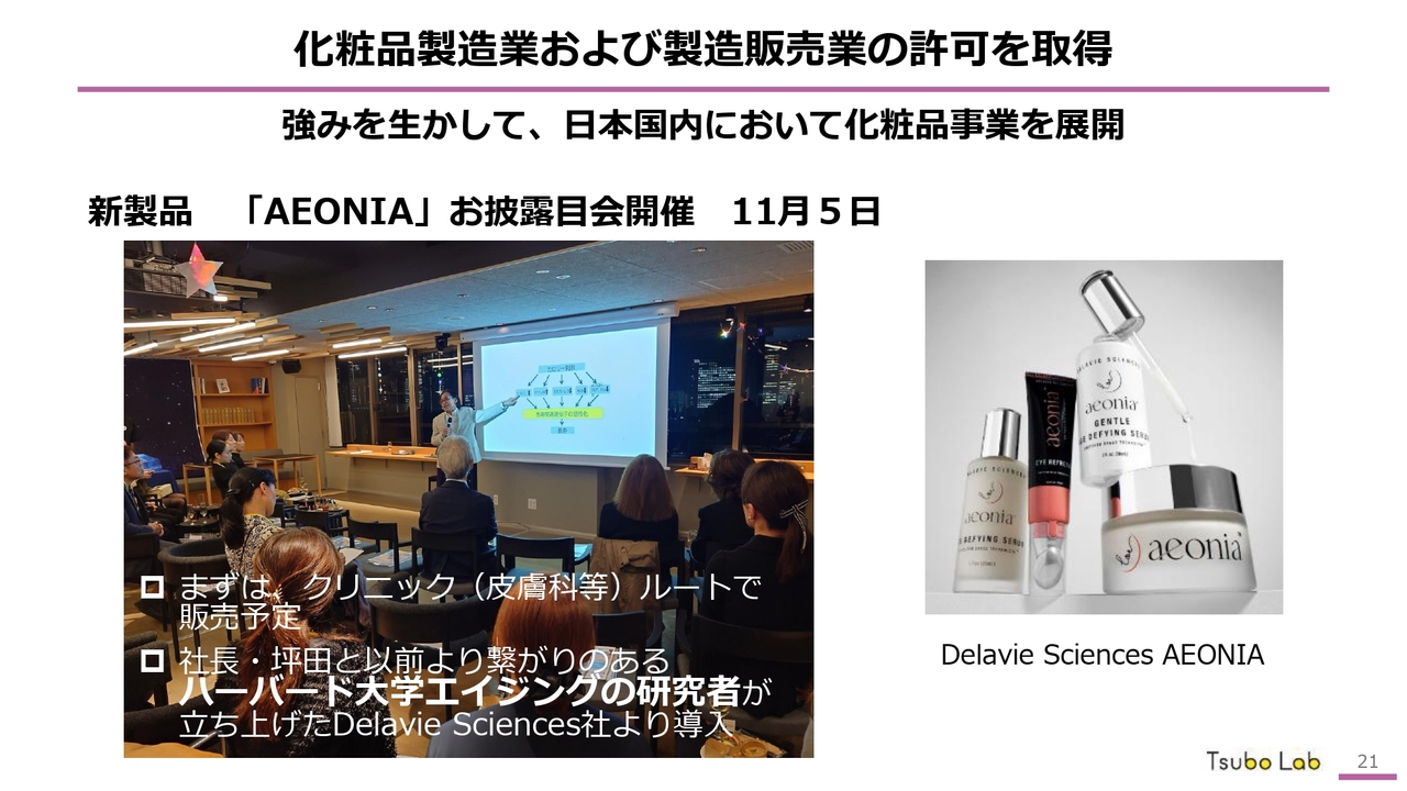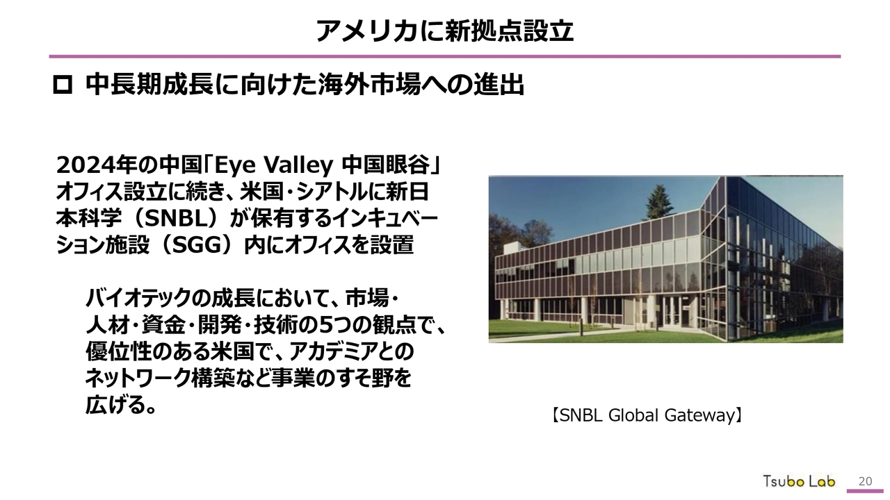 将来の中長期的な成長に向けた海外市場への進出として、アメリカに新拠点を設立しました。将来的には、坪田ラボ自身もアメリカでの治験を視野に入れて検討しています。