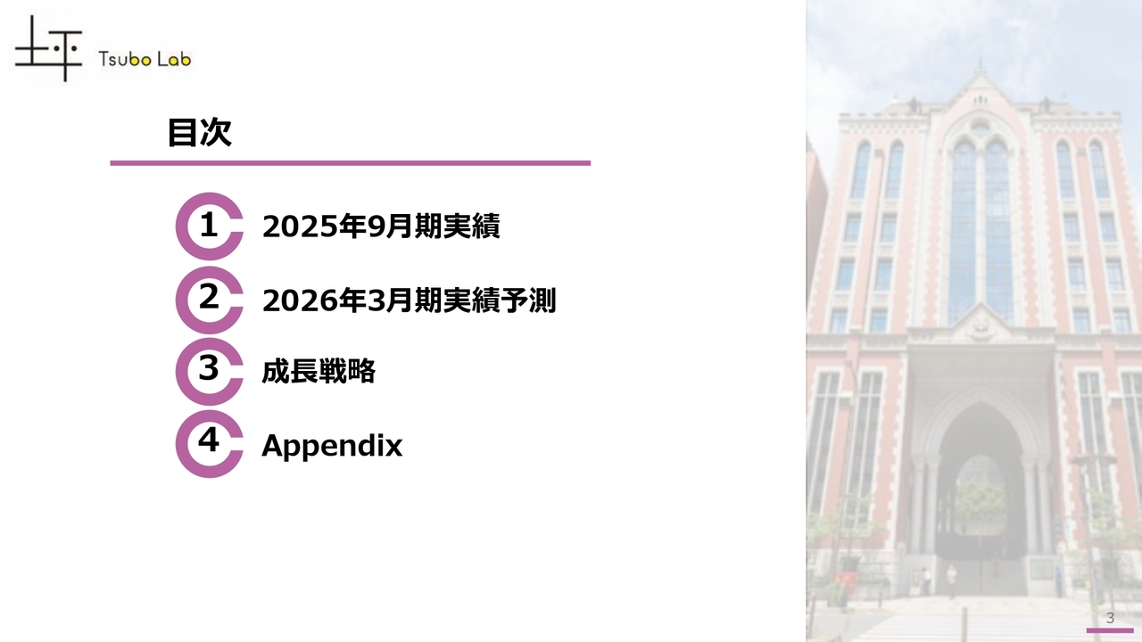 坪田一男氏(以下、坪田):2026年3月期中間決算についてご説明します。株式会社坪田ラボ代表取締役社長の坪田です。我々の基盤となるミッションとして、「VISIONary INNOVATIONで未来をごきげんにする」という言葉の下で、みんなで働きながらがんばっています。