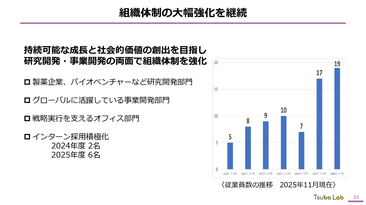現在、坪田ラボのスタッフを増員しています。無限に増えるわけではありませんが、上場当初はスタッフが9人でしたが、現在は19人となっています。