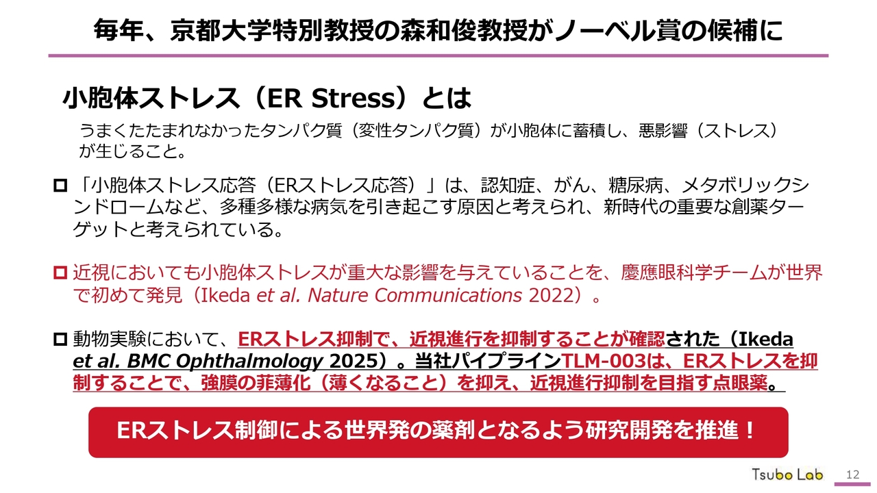 「TLM-003」は、森教授がノーベル賞候補にもなっているERストレスを対象とし、強膜の菲薄化に対応する点眼薬です。現在、近視進行抑制の領域において、これら3つのパイプラインをもって取り組んでいます。