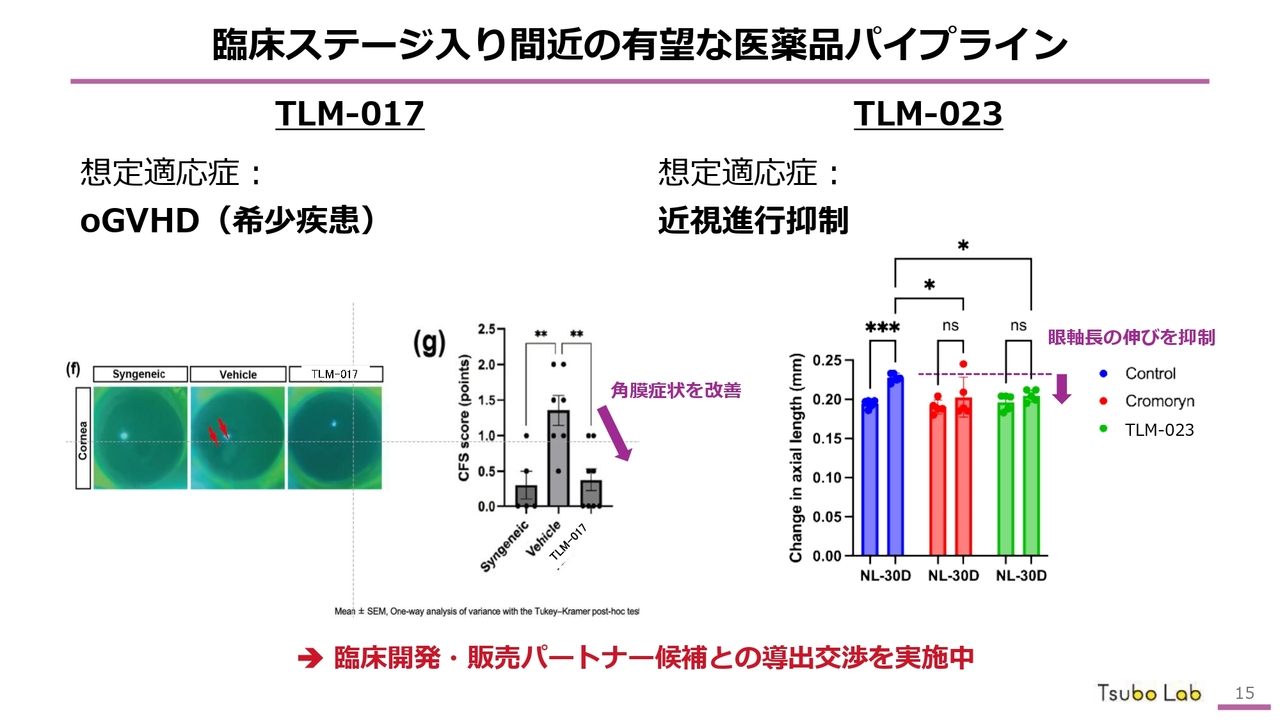 臨床ステージ入りが目前に迫った有望な医薬品パイプラインについてご説明します。1つ目は「TLM-017」です。これは、ドライアイの中でも特に症状の強いOcular GVHD(oGVHD)に対する点眼薬を開発するものです。oGVHDは、骨髄移植後に発生するドライアイであり、我々はこの点眼薬の臨床開発を次の期に進めていきたいと考えています。