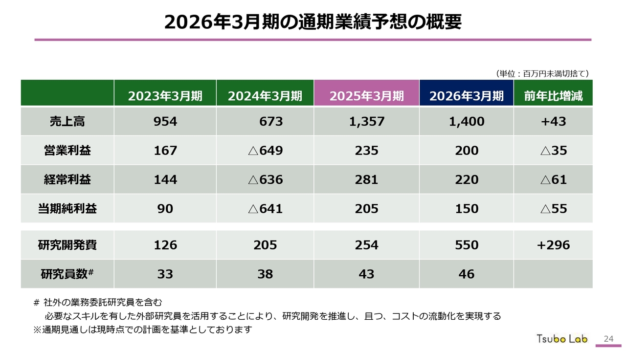 坪田:現在、我々のビジネスモデルは、契約一時金とマイルストーンの段階にあります。まだロイヤリティ収入は発生していません。実際の契約に少し時間がかかっており、今期も若干の赤字が出ています。
