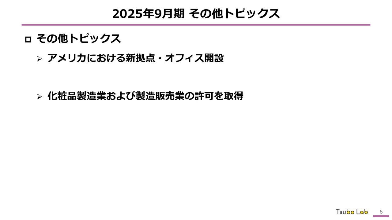 その他のトピックスとして、アメリカに新たな拠点およびオフィスが開設されました。また、化粧品製造業および製造販売業の許可を取得し、新たな皮膚科領域での競争も始まりつつあります。