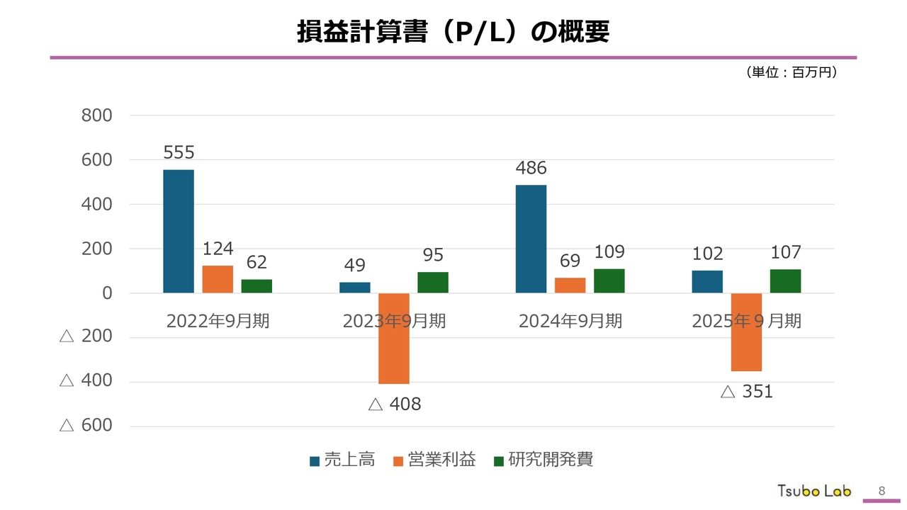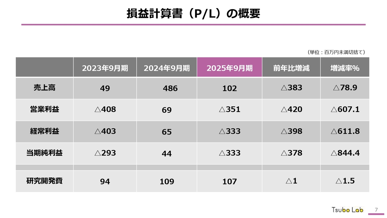 P/Lの概要です。スライドの表中央をご覧ください。2025年9月期の売上高は1億200万円、営業損失は3億5,100万円、経常損失は3億3,300万円、当期純損失は3億3,300万円です。また、研究開発費には1億700万円を使用しています。