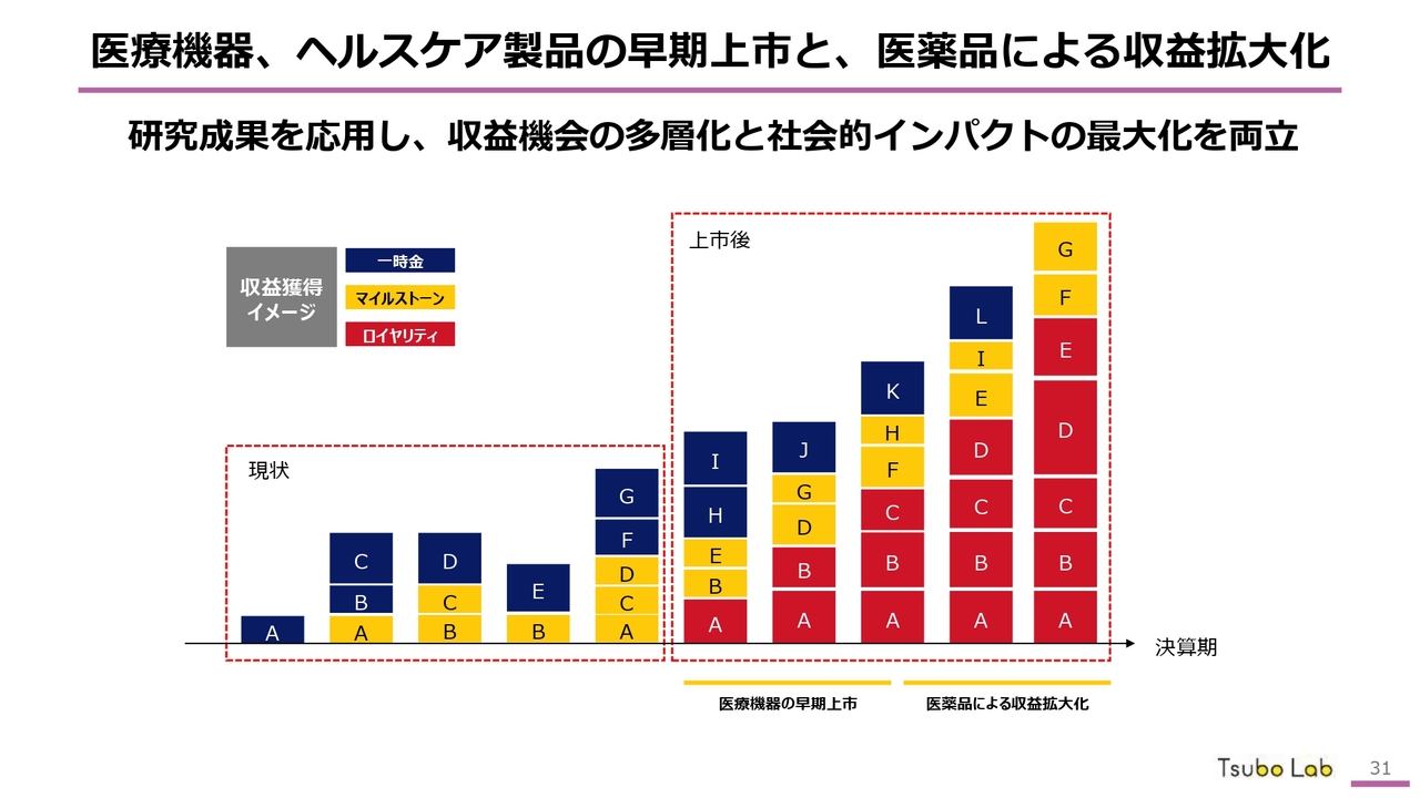 坪田ラボは、まだ短期的な契約一時金とマイルストーンの段階にとどまっており、まだロイヤリティの獲得には至っていません。大きな製品がまだ上市されていない状況です。中長期的には、製品販売に伴うロイヤリティで安定収益を得ることが、当社のビジネスモデルです。
