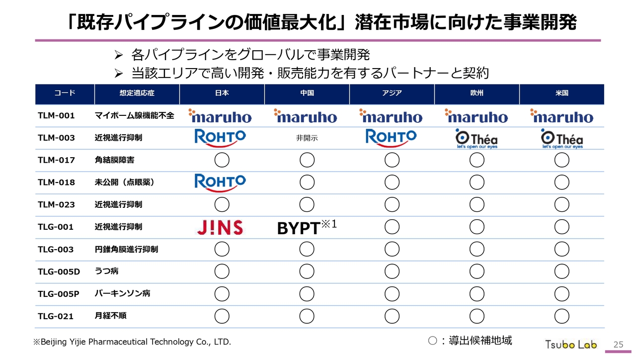 現在のパイプラインについて、あらためてご説明します。スライドの表に示されているとおり、マルホやロート製薬などのロゴが記載されている部分は、すでに契約が済んでいるものです。一方、丸印が記載されている部分はまだ契約パートナーが決まっておらず、現在、事業開発チームや営業チームが非常に精力的にパートナーを探している最中です。