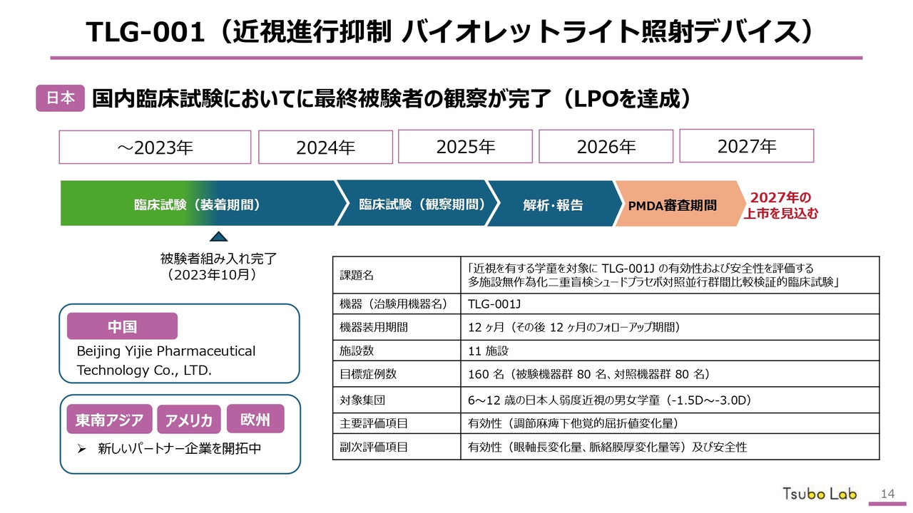 【QAあり】坪田ラボ、研究開発が順調に進捗 近視進行抑制バイオレットライト照射デバイス「TLG-001」の国内臨床試験LPOを達成