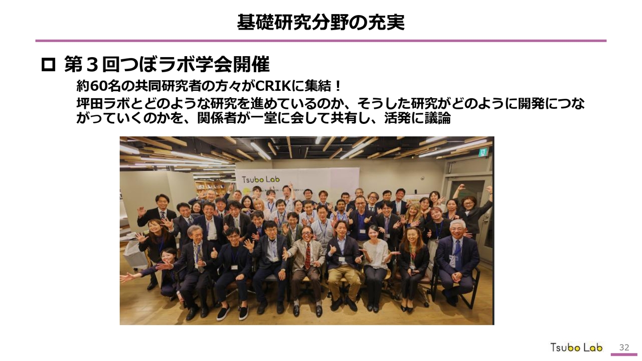 つまり、ヘビーアセットではなく、ライトアセット型のモデルを採用しています。我々は、研究者の方々と契約を結び、一緒に知を創造する取り組みを行っています。そのため、単に研究室に委託して研究を行うのではなく、つぼラボ学会を中心に据えた、非常にユニークなR&Dの手法を採用しています。